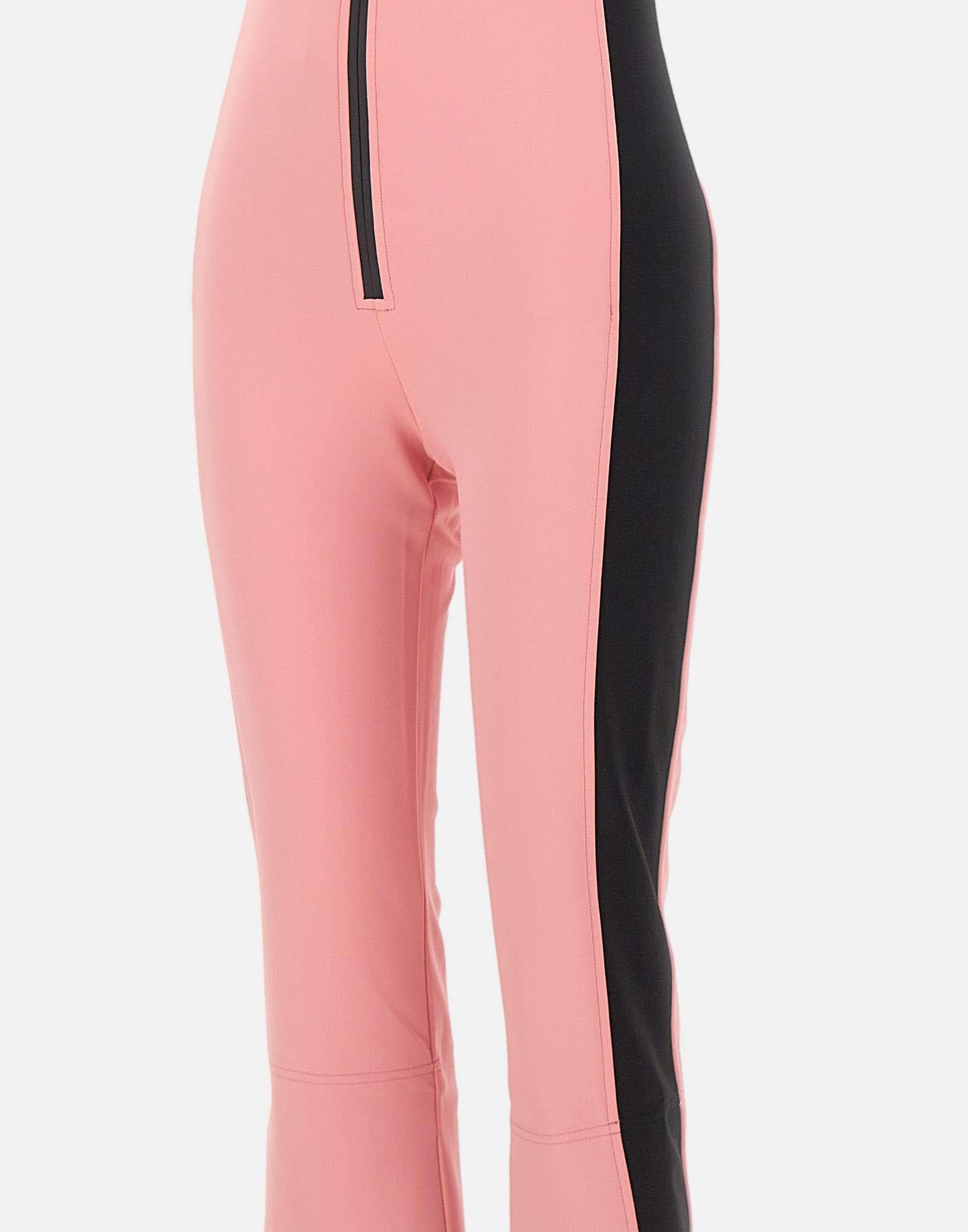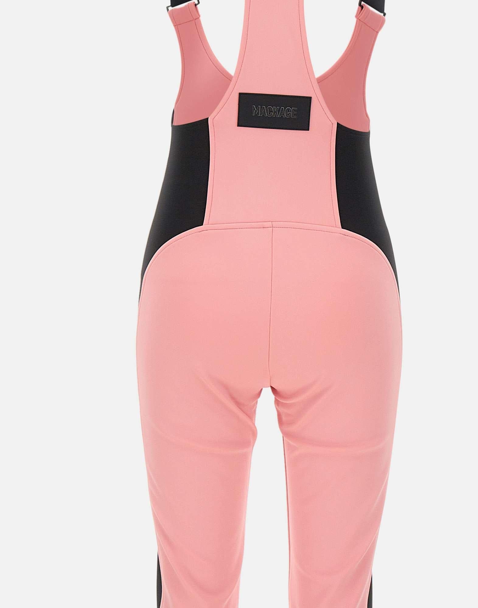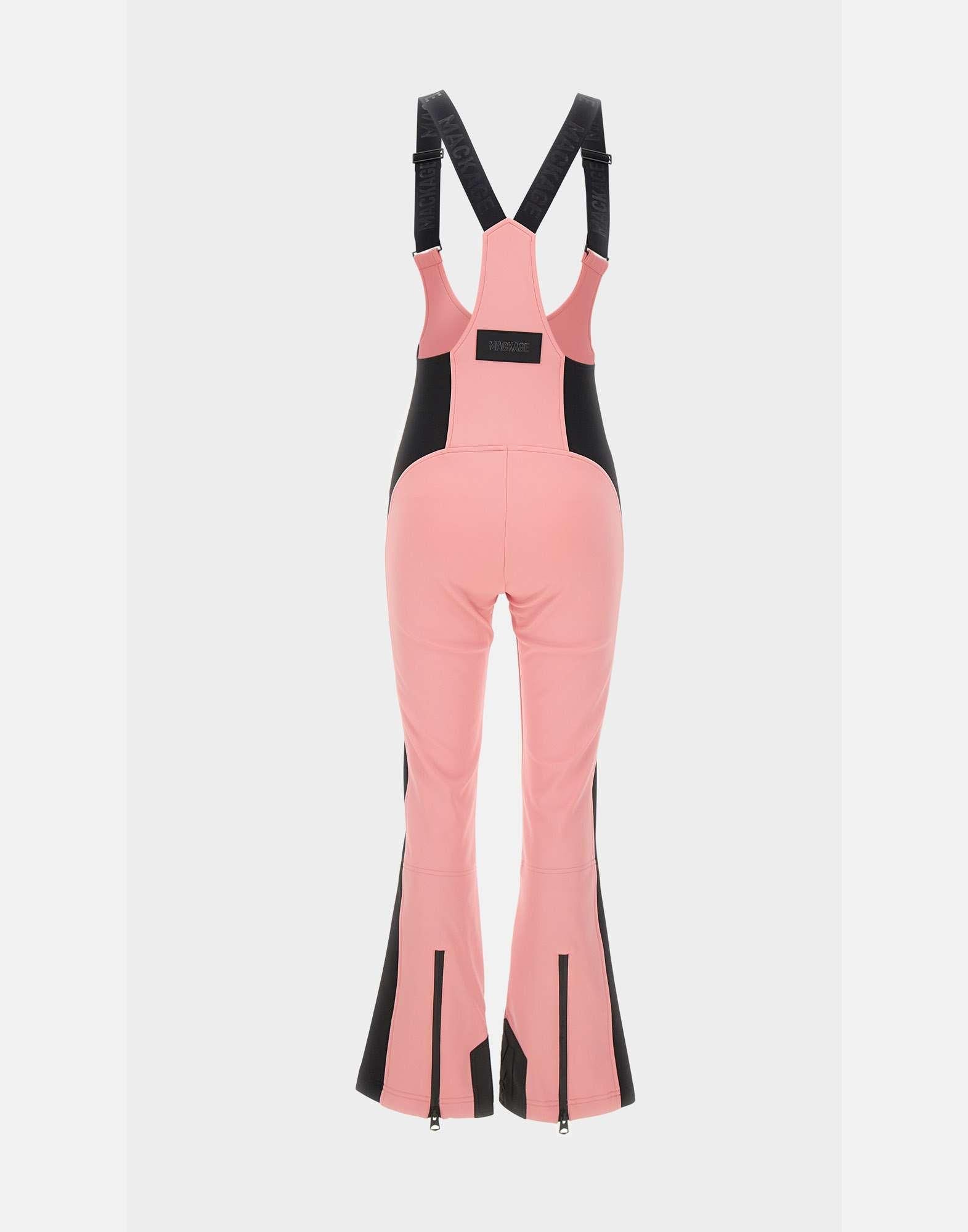 Mackage "GIA Agile-360" Ski Suit in pink and black, crafted from high-performance stretch technical fabric offering windproof and water-resistant protection up to -20°C. The Agile-360 construction ensures full freedom of movement while maintaining a sleek, body-contouring slim fit. Features include adjustable branded suspenders, front zip closure, and a logo detail at back combining advanced mountain functionality with refined, modern design.