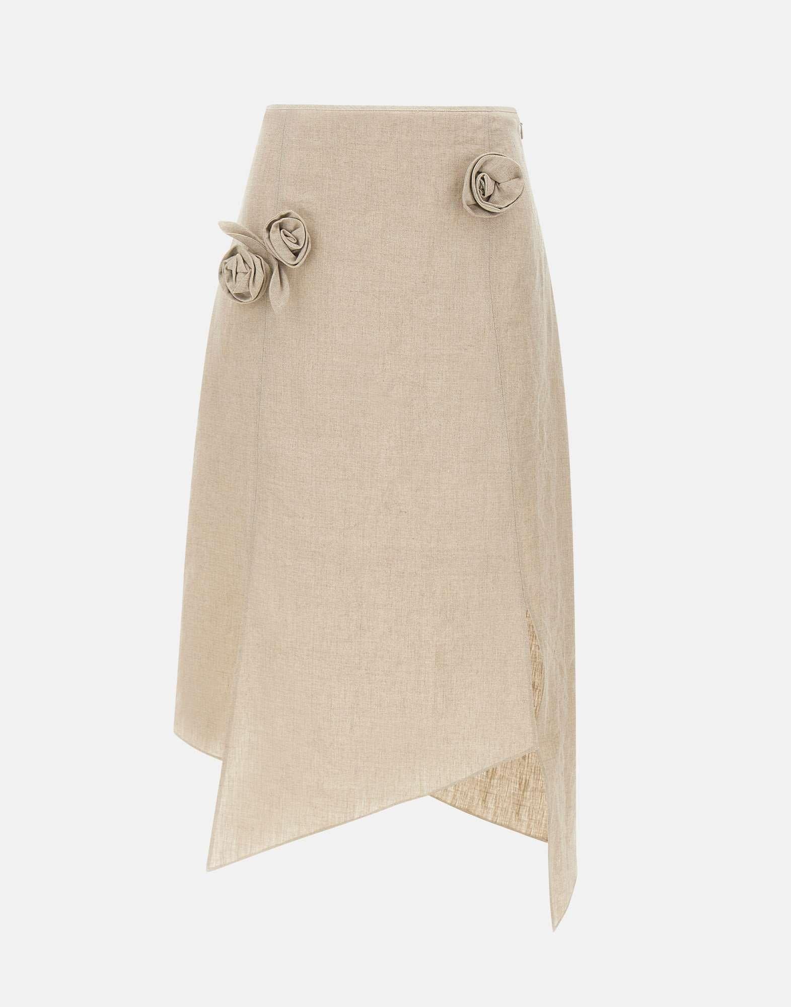Coperni women's skirt "Flower" crafted from beige linen, offering a softer summer take on the Flower silhouette. The design reworks Coperni's signature rose-knot detail in a natural linen texture, wrapping the hips with fluid movement. Cut in an asymmetric, slightly flared midi length, it features two front slits and a concealed side zip closure for a clean finish.