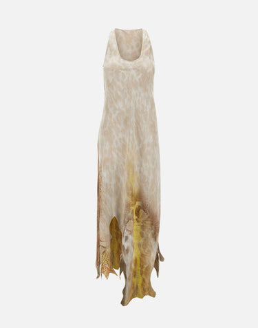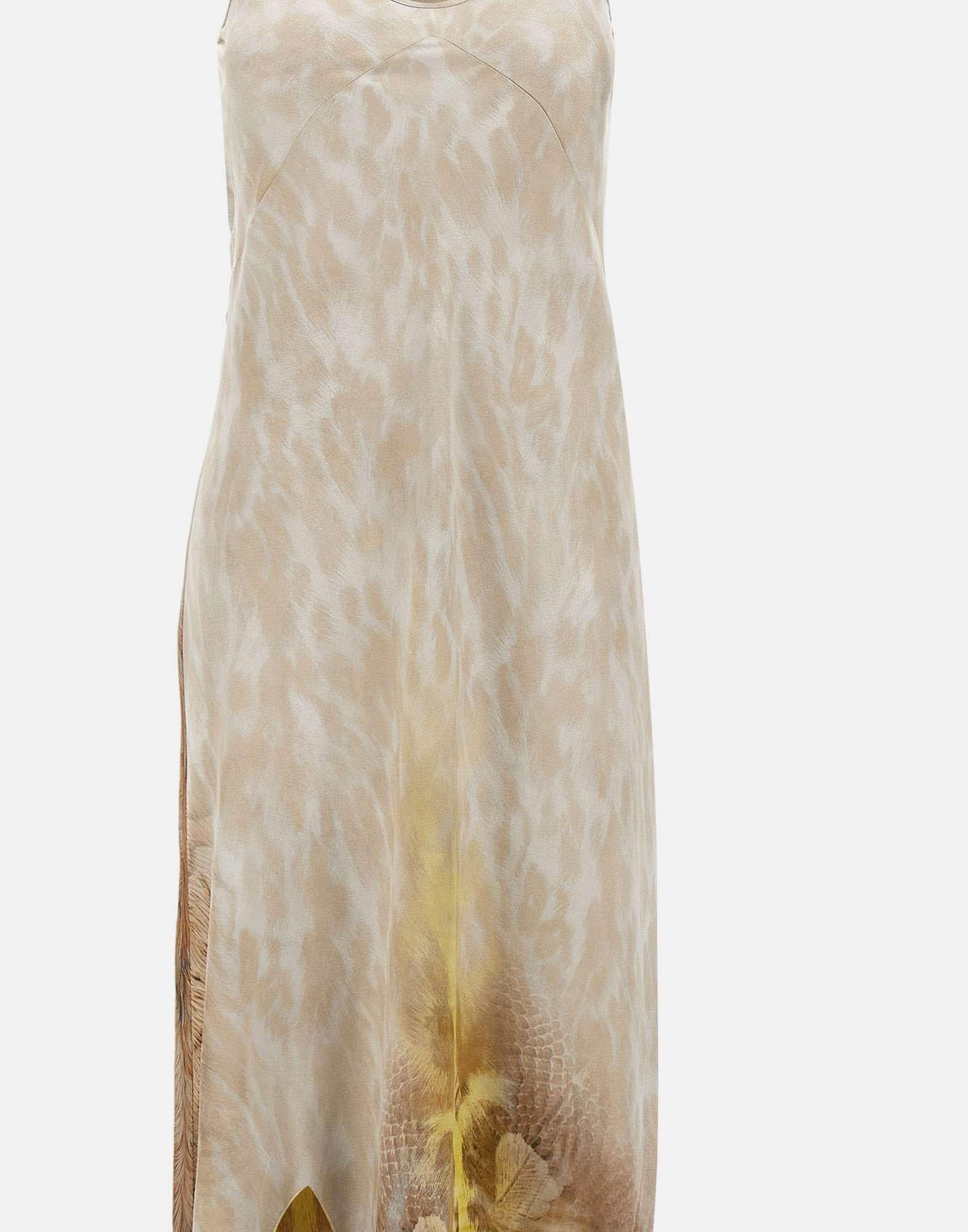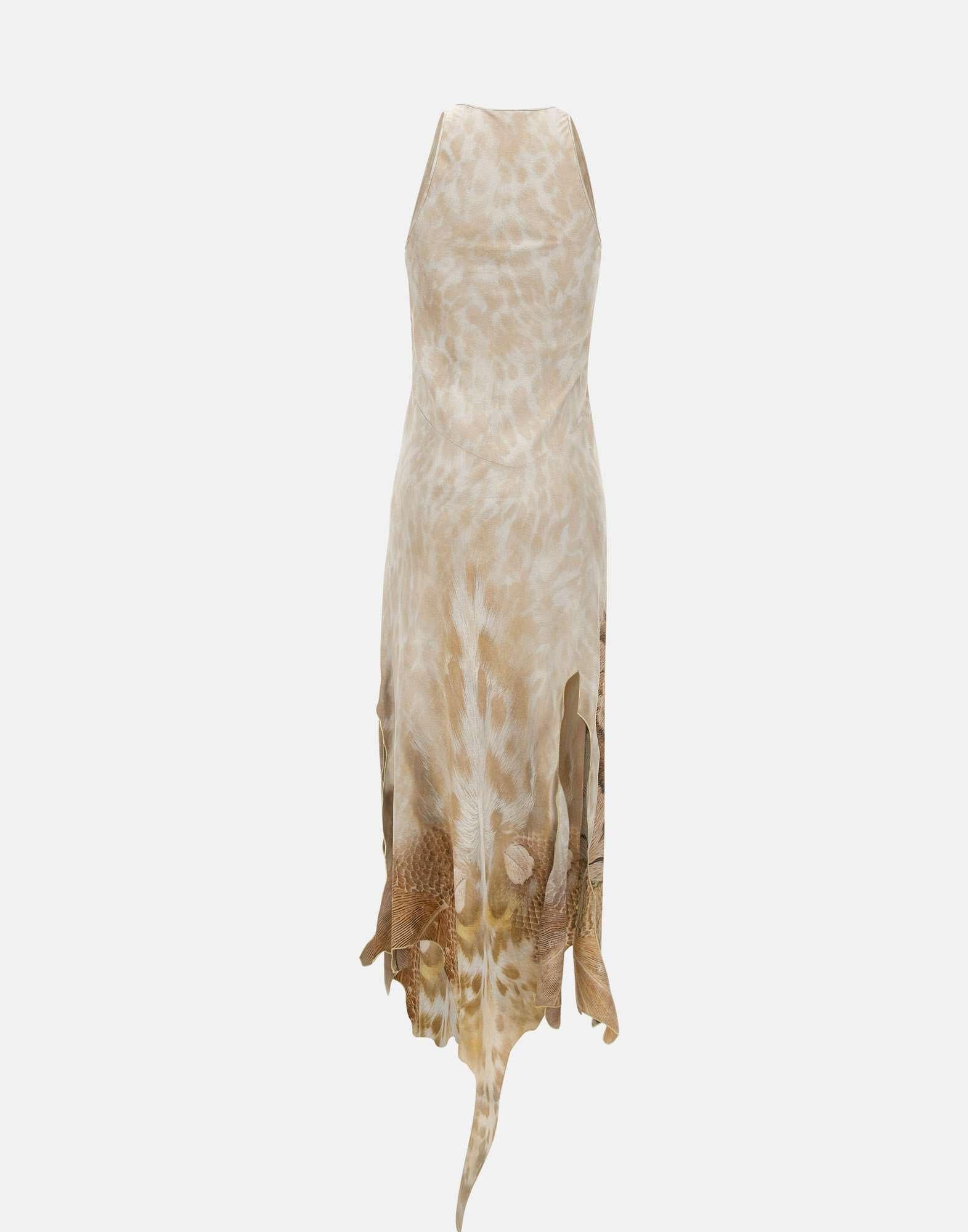 Diesel women's long dress "D-Ikara" crafted from soft viscose with a multicolor feather print, designed for fluid movement and a statement look. Sleeveless with a deep round neckline, it offers a modern, flattering line. The asymmetric hem with side slits adds dynamic motion, while finished hems complete the design with a clean touch. Regular fit.