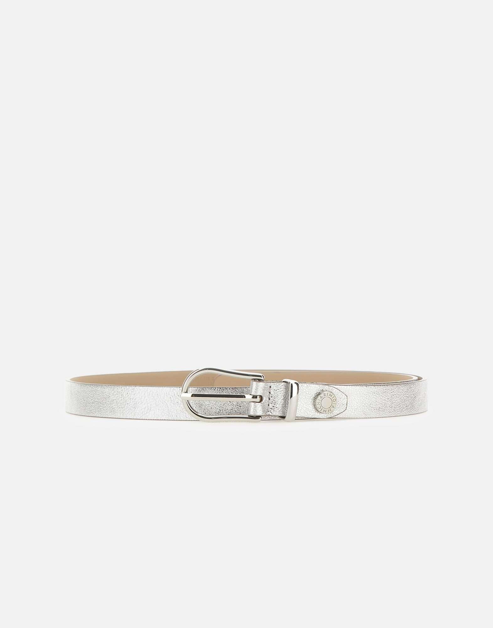 Gianni Chiarini women's belt made of silver-colored leather, an essential accessory with an elegant and contemporary feel. The 2 cm wide model is finished with a silver-colored logo buckle that adds a touch of sparkle. One size fits all. Made in Italy.