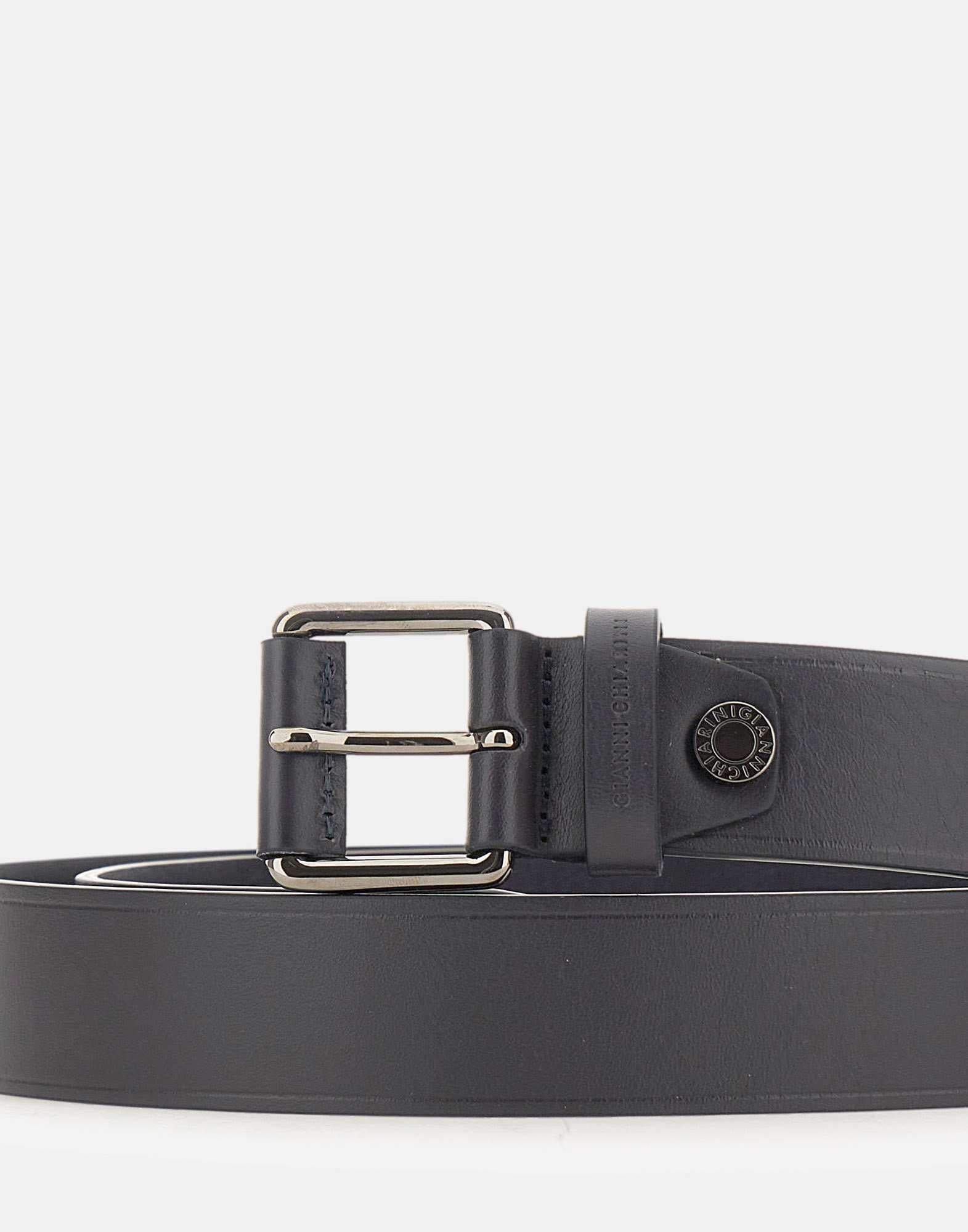 Gianni Chiarini men's blue leather belt, designed to finish any outfit with understated elegance. The 3.5 cm width is paired with a glossy silver buckle featuring blue leather details for a modern, refined look. The embossed logo on the front adds a subtle signature touch. One size. Made in Italy.