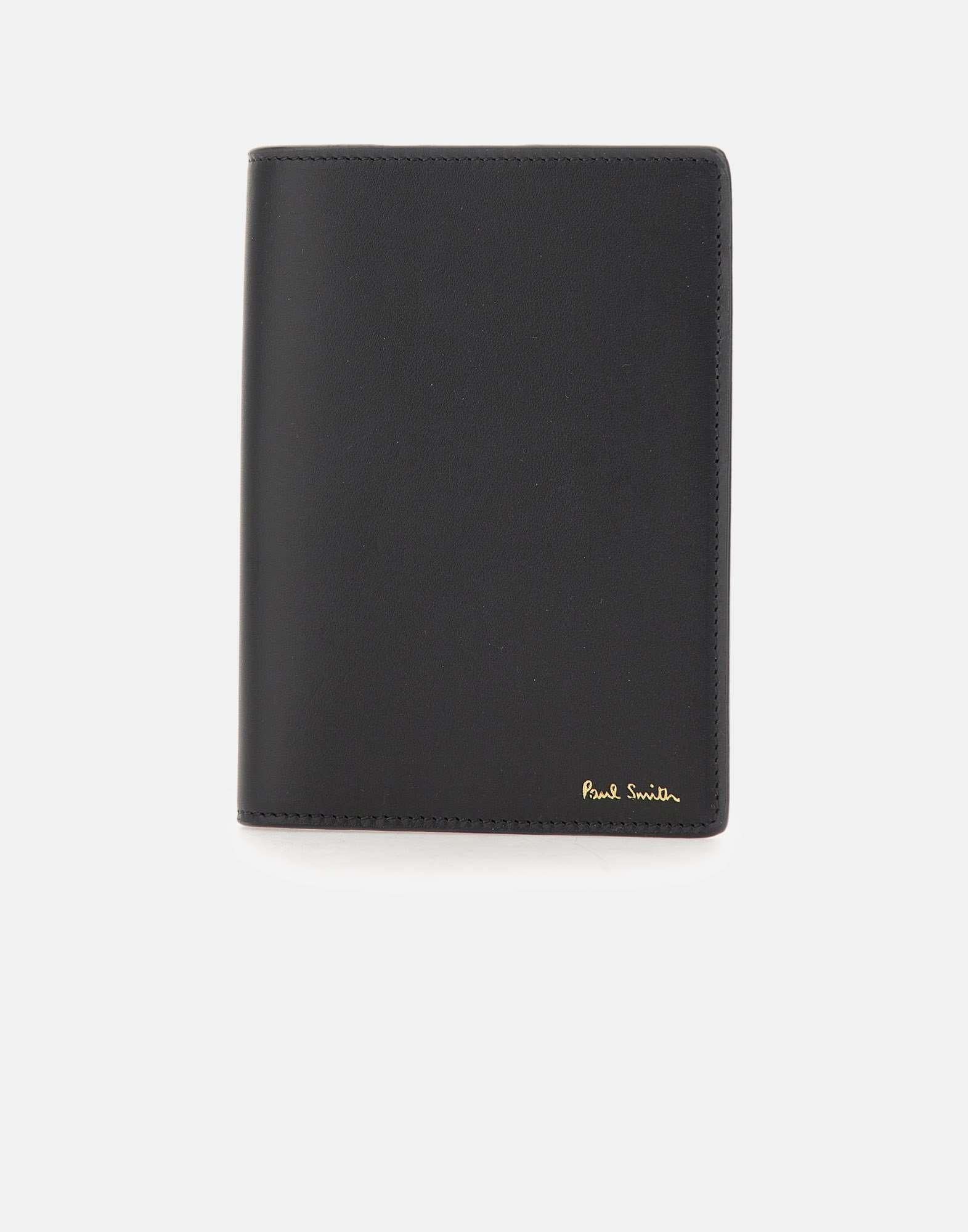 Paul Smith passport holder crafted from soft black leather, defined by an essential and refined design. The textured interior is enhanced by the iconic multicolor "Signature Stripe" pattern, a distinctive detail that adds personality and recognizability to the accessory. Made in Italy, this travel wallet features three internal slots designed to hold credit cards or business cards, offering practicality and organization in a compact format. The small gold logo at the corner completes the design with an elegant and discreet touch. Dimensions: 13.7x9.8 cm.