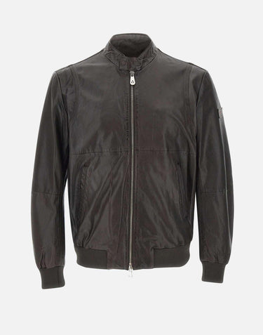 Peuterey "Tureia" men's leather jacket, dark brown, button-down mandarin collar, two-way front zip fastening, side welt pockets, inside pockets, lined, contrasting ribbed knit cuffs and hem, logo patch on left sleeve, regular fit