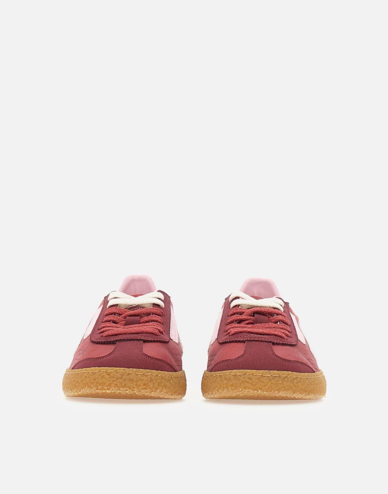 Puraai womens "XS CHERRY JUICE" sneakers in cherry red, finished with pink contrast inserts for a fresh, contemporary look. Crafted from recycled and organic materials, these sneakers follow an eco-friendly and cruelty-free approach, combining conscious style with modern design. They feature double flat laces, one red and one cream, allowing easy personalization. Logos on the tongue and heel complete the design, while the 3 cm amber-colored rubber sole ensures comfort and a balanced silhouette for everyday wear.