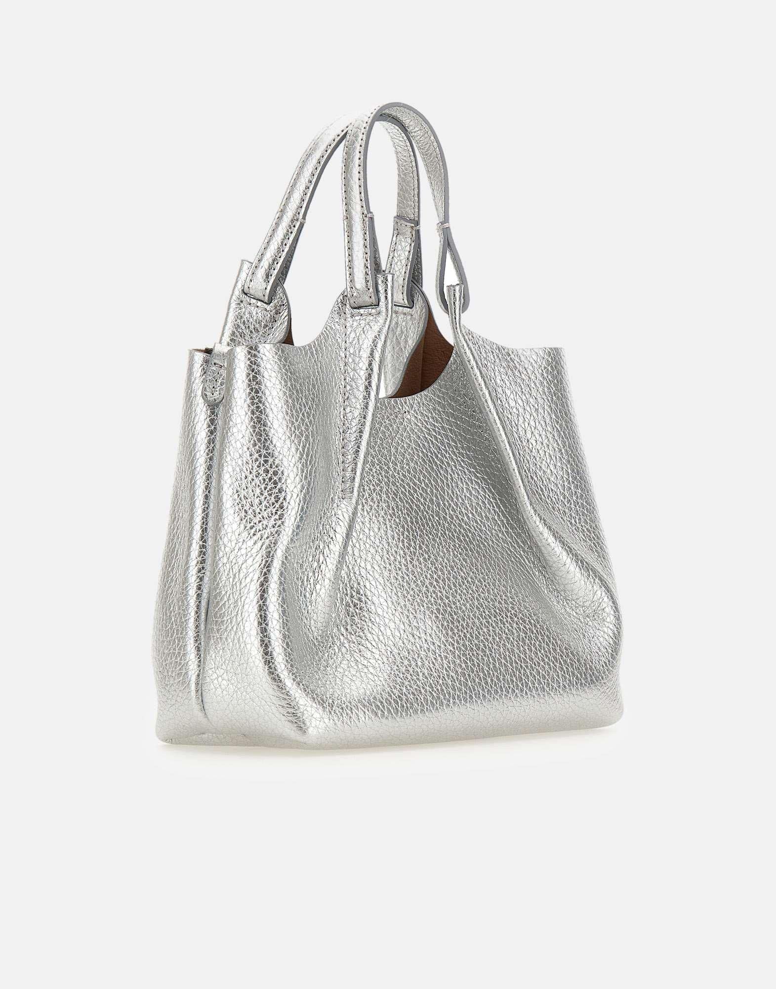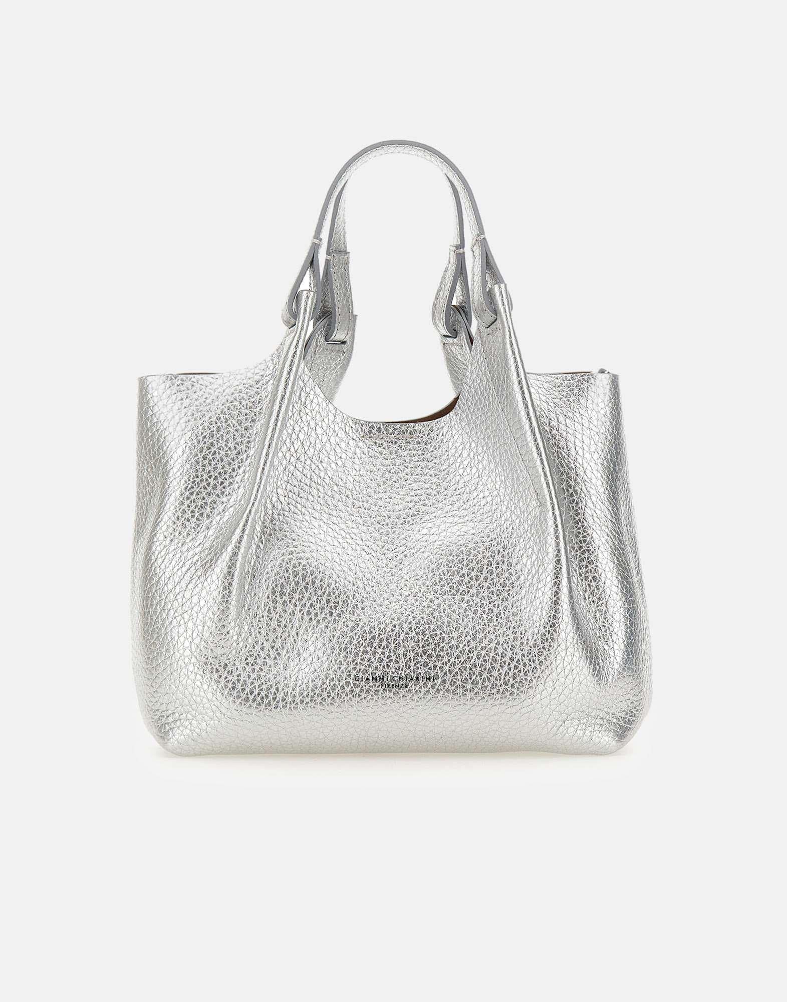 Gianni Chiarini women's handbag "Dua" crafted from silver bubble double leather with a unique, luminous texture. Designed with an unlined single compartment, it features matching double handles and a coordinated adjustable, removable strap for crossbody wear. A matching inner pouch is included. The magnetic button closure is complemented by a central hook that, when fastened, changes the shape of the bag for added versatility. Dust bag included. Made in Italy. Size: 24x27x12 cm.