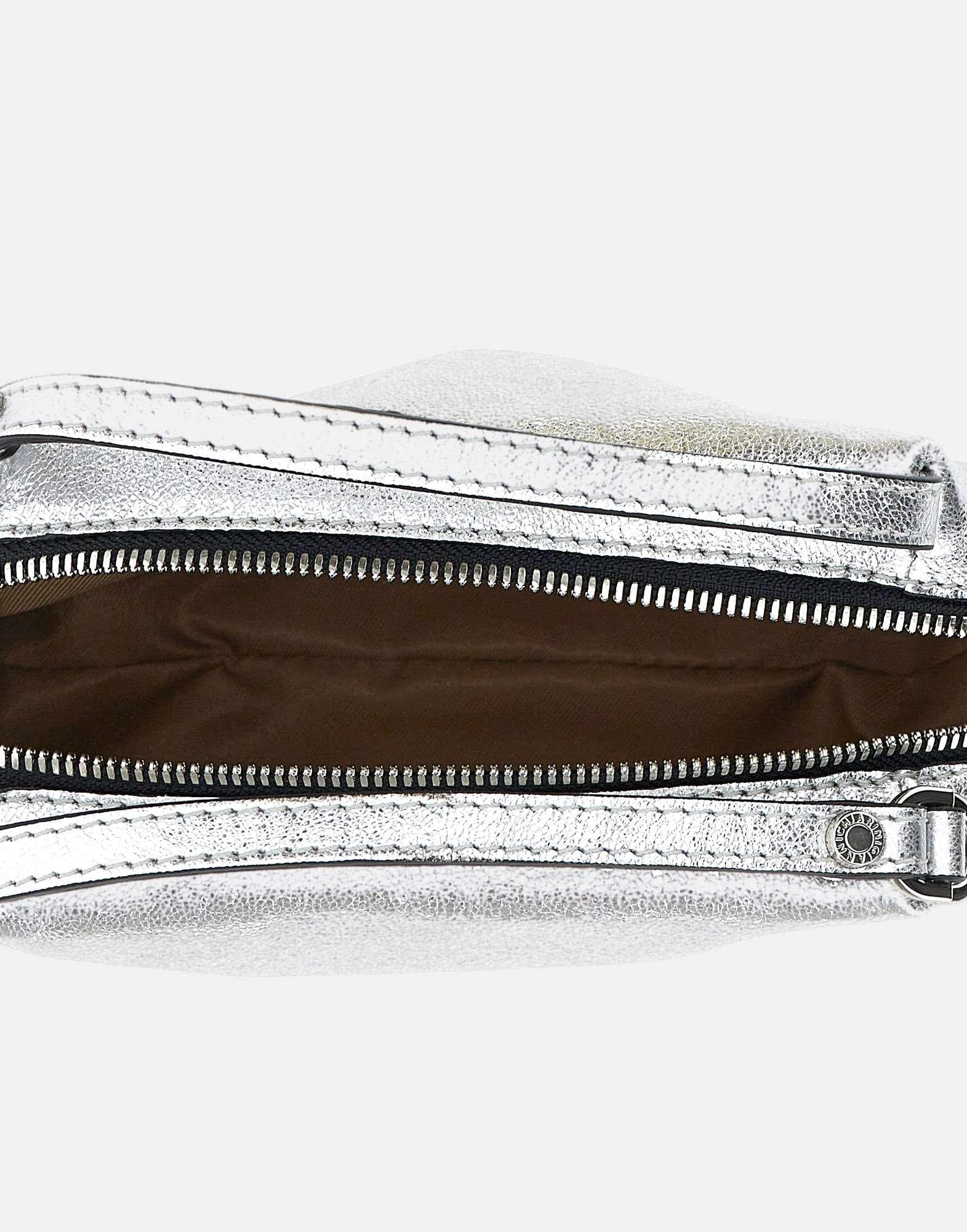 Gianni Chiarini women's handbag "Alifa" crafted from silver-tone leather in a compact, versatile silhouette. It features a top zip closure with a branded leather puller, double top handles, and a slim removable strap for crossbody wear. An everyday essential with a bright touch. Dust bag included. Made in Italy. Size: 21x12x8 cm.