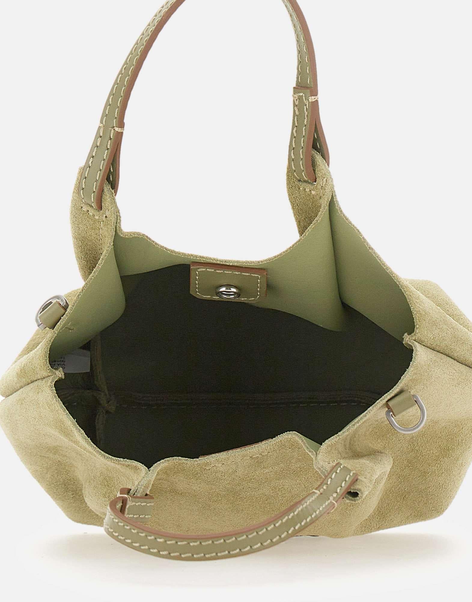 Gianni Chiarini women's handbag "Dua" crafted from sage green suede with raw-cut edges and a clean, essential design. It features an unlined single compartment with a snap-button closure, double top handles, and a logo patch at the lower front. The adjustable, removable strap allows crossbody wear, making it practical for everyday use. Dust bag included. Made in Italy. Size: 18x16x9 cm.