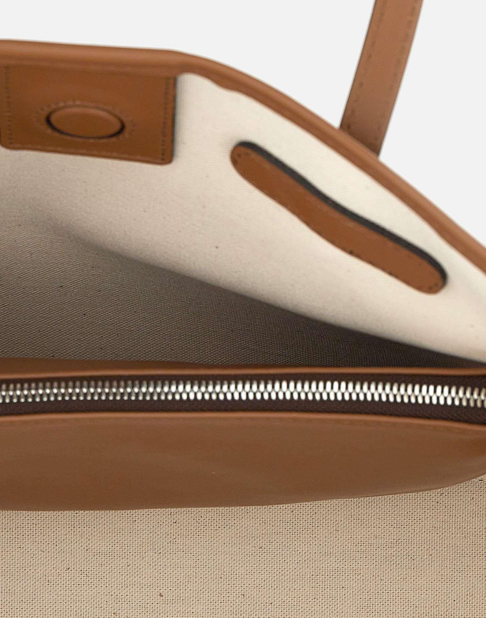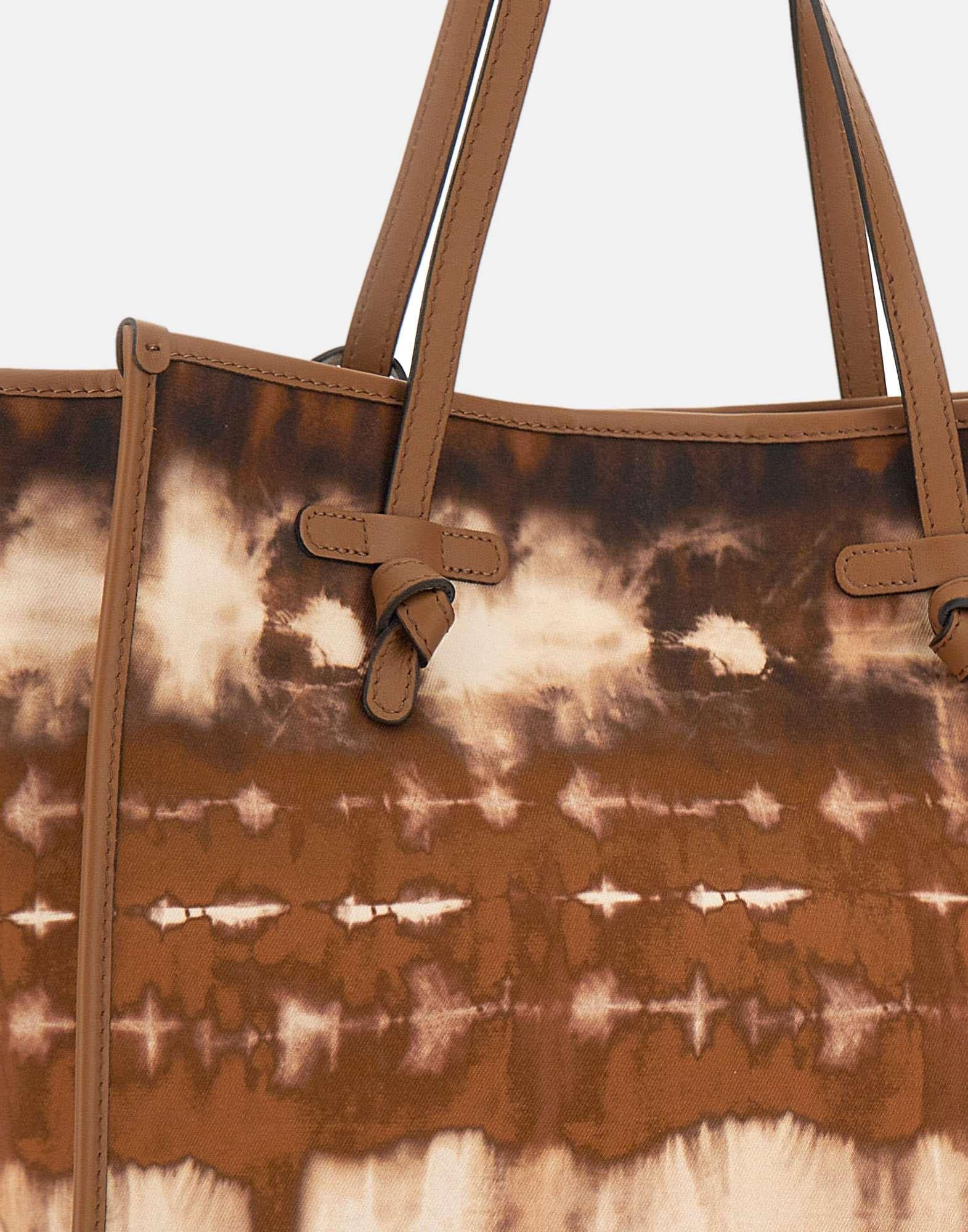 Marcella Club Gianni Chiarini women's shoulder bag "Marcella" crafted from canvas with a tie-dye pattern in brown and beige tones, finished with brown leather trims and handles. Its clean, modern silhouette is designed for everyday use and features a magnetic closure and a matching inner leather pouch to keep essentials organized. Finished with a leather logo patch on the side. Dust bag included. Made in Italy. Size: 38x31x16 cm.