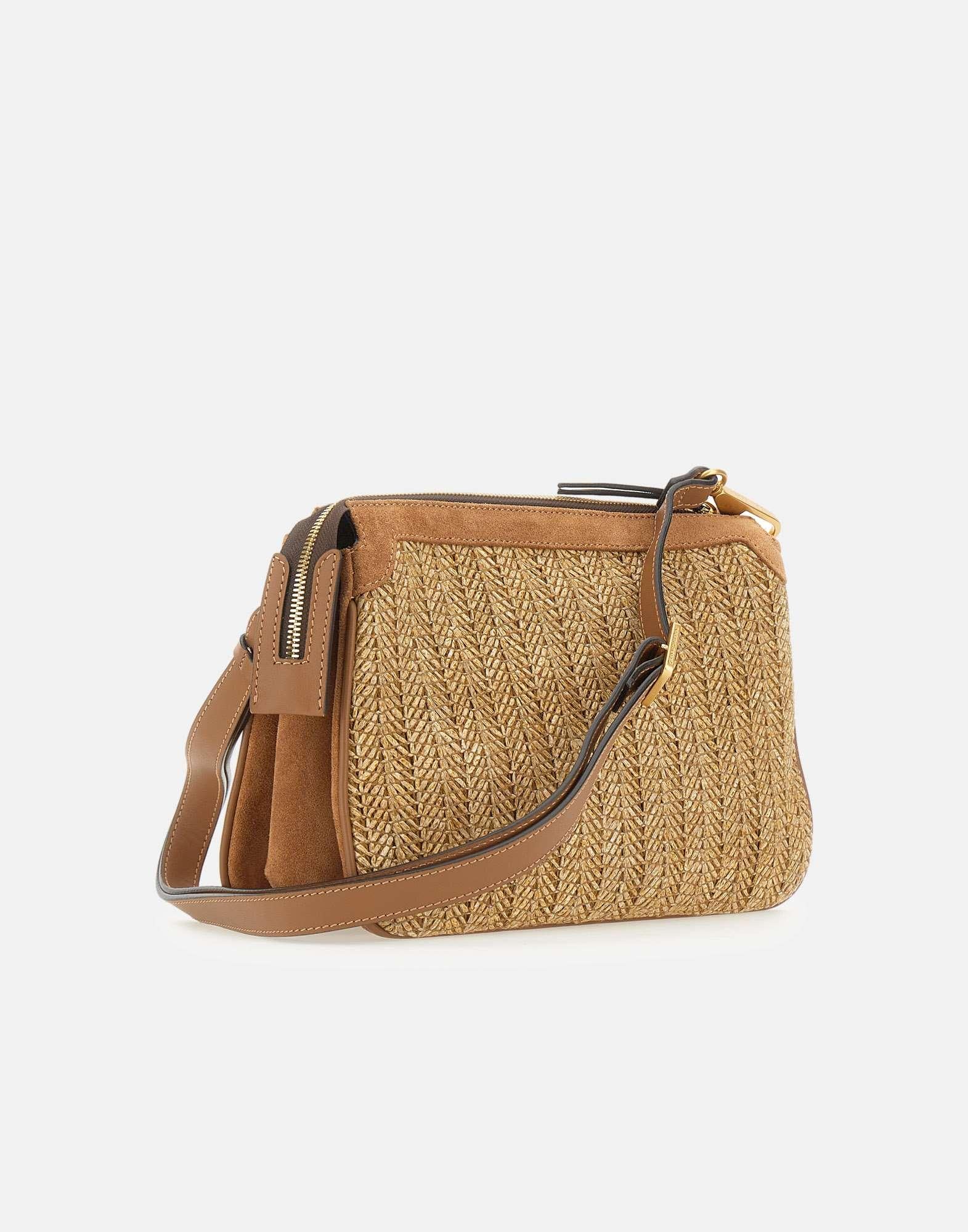 Gianni Chiarini women's crossbody bag "Brooke" in beige, crafted from suede leather and woven straw for a rustic-chic summer feel. Simple yet elegant, it adds a warm-weather touch while staying practical for everyday use, from the beach to the city. Finished with leather trims, it features a top zip closure and a removable handle detailed with a snap hook clasp. The interior is organized with three compartments and two inner pockets, including one zip pocket, to keep essentials neatly stored. Made in Italy. Size: 28x20x15 cm.