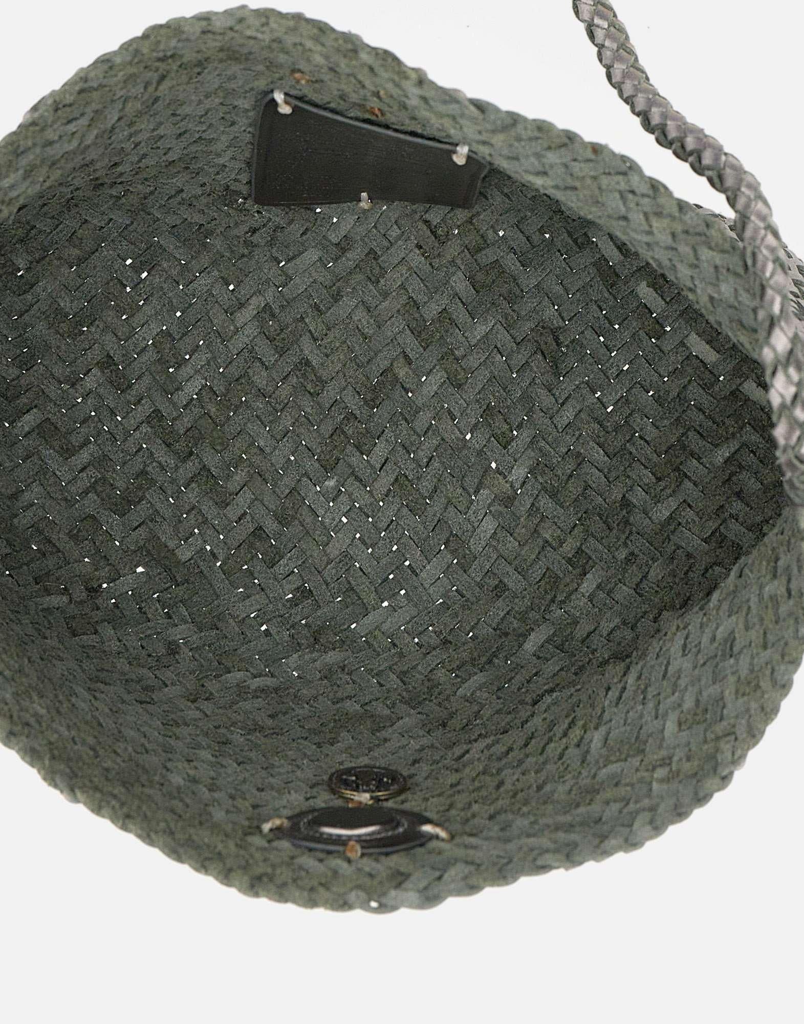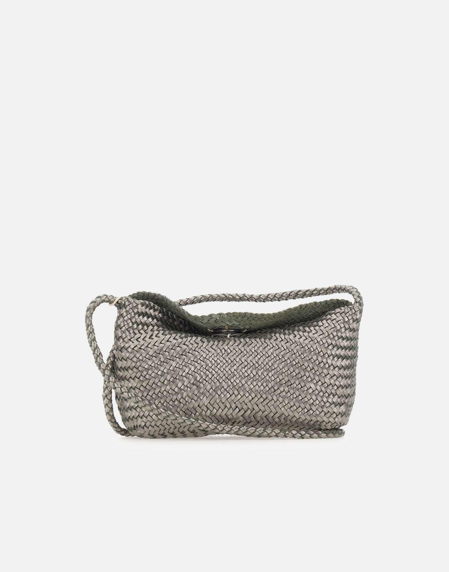 Dragon Diffusion women's "Corsina" crossbody bag crafted from aluminium-toned woven leather, designed to combine craftsmanship and everyday practicality in a compact format. The flap and magnetic button closure provides a clean, secure finish. Unlined and fitted with a shoulder strap, it can be worn comfortably on the shoulder or crossbody, moving effortlessly from day to evening looks. Inside, a hand-stitched antique-finish Saint Christopher medal pays tribute to the patron saint of travelers and serves as the brands mark of authenticity. Supplied with dust bag. Dimensions: 24x13x7 cm.