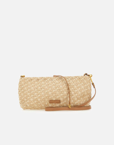 Gianni Chiarini women's crossbody bag "Mercy" crafted from sand-colored woven straw with tan leather inserts, designed for a clean, refined summer look. The zip closure is finished with leather ties and gold-tone details for a bright accent, while a front leather logo patch signs off the style. It features an adjustable and removable leather shoulder strap for versatile wear. Unlined interior with a single compartment. Dust bag included. Size: 32x16x6 cm.