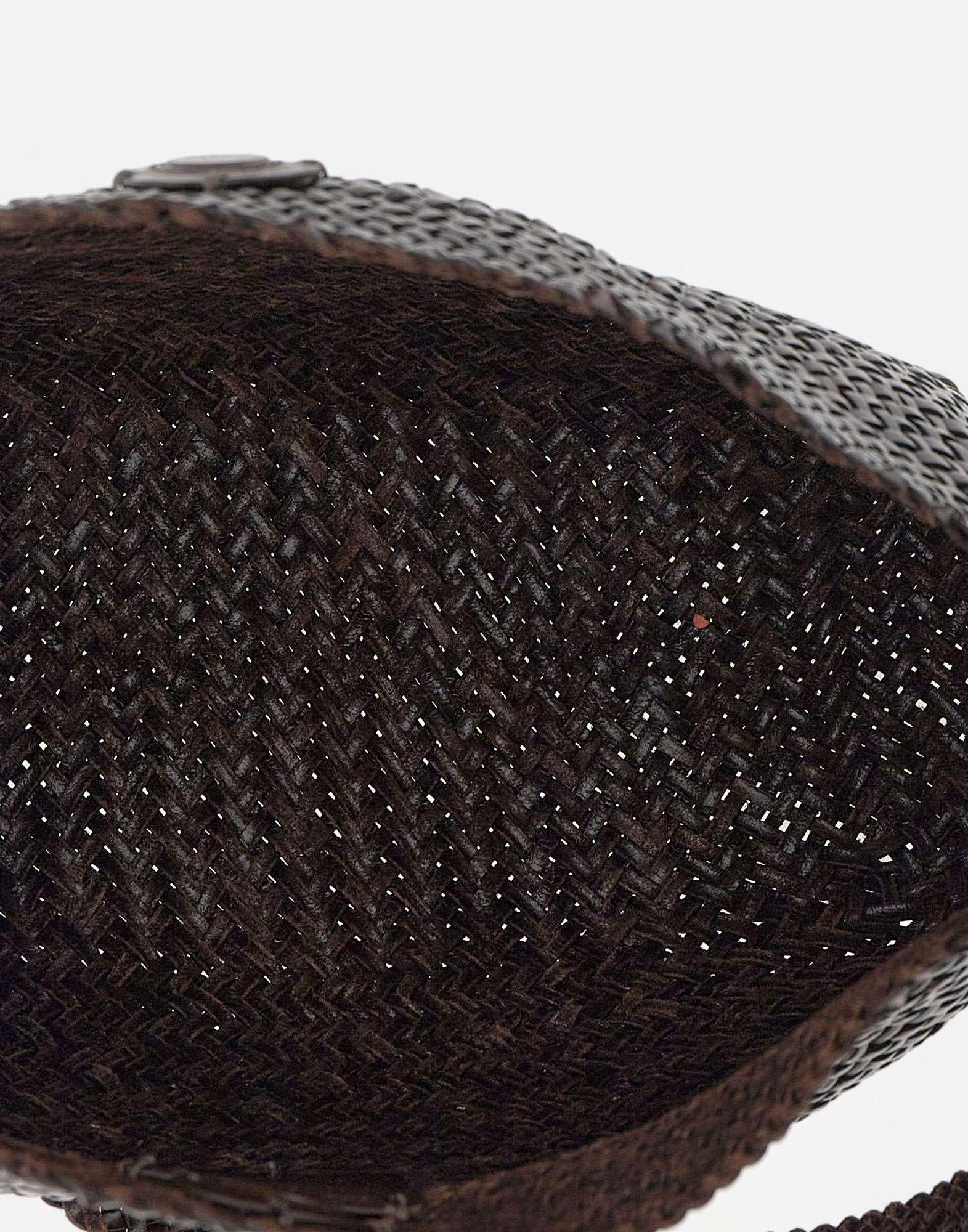 Dragon Diffusion women's "Santa Marta" crossbody bag crafted from dark brown woven leather, showcasing authentic craftsmanship and timeless appeal. The distinctive 3.5 mm diagonal weave adds texture and structure while maintaining a soft, natural feel. The bag closes with a flap and magnetic button for a clean, secure finish. Unlined and designed with a shoulder strap, it can be worn comfortably on the shoulder or crossbody, making it ideal for everyday use. Inside, a hand-stitched antique-finish Saint Christopher medal pays tribute to the patron saint of travelers and serves as the brands mark of authenticity. A versatile accessory for any wardrobe. Supplied with dust bag. Dimensions: 33 x 22 x 10 cm.