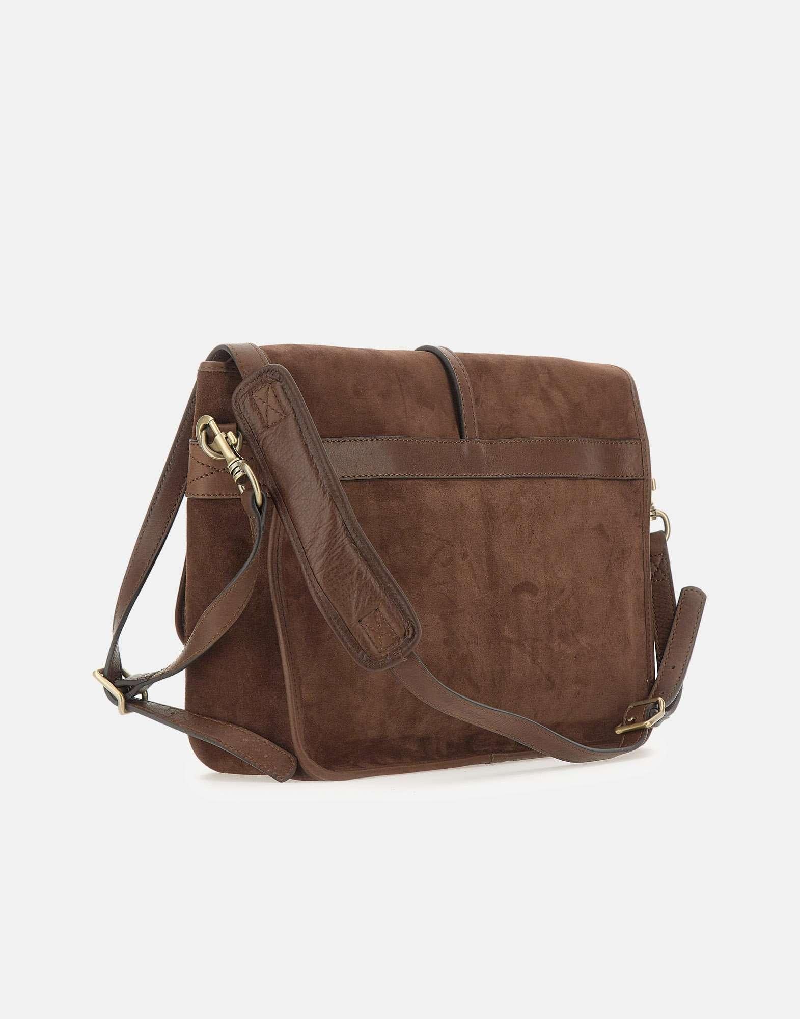 Gianni Chiarini "Berlino" crossbody bag crafted from chocolate brown suede leather with leather details, designed for a warm and refined aesthetic. Features a flap closure with metal hook fastening. Equipped with two front snap-button pockets, the interior includes a zipped pocket and two slip pockets for practical organization. Finished with a leather logo patch on the flap and an adjustable, removable leather shoulder strap. Made in Italy. Dimensions 37x30x10.5 cm.