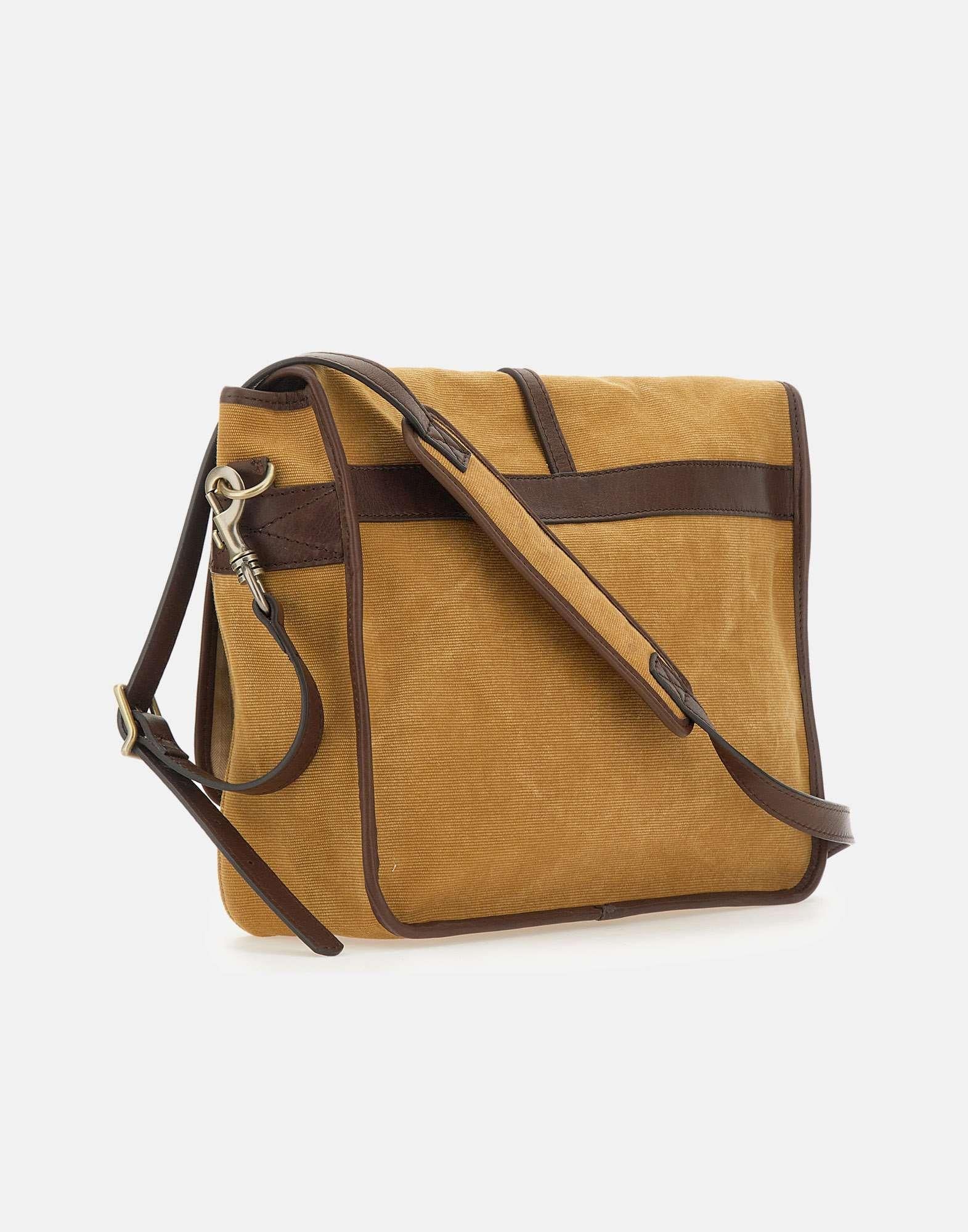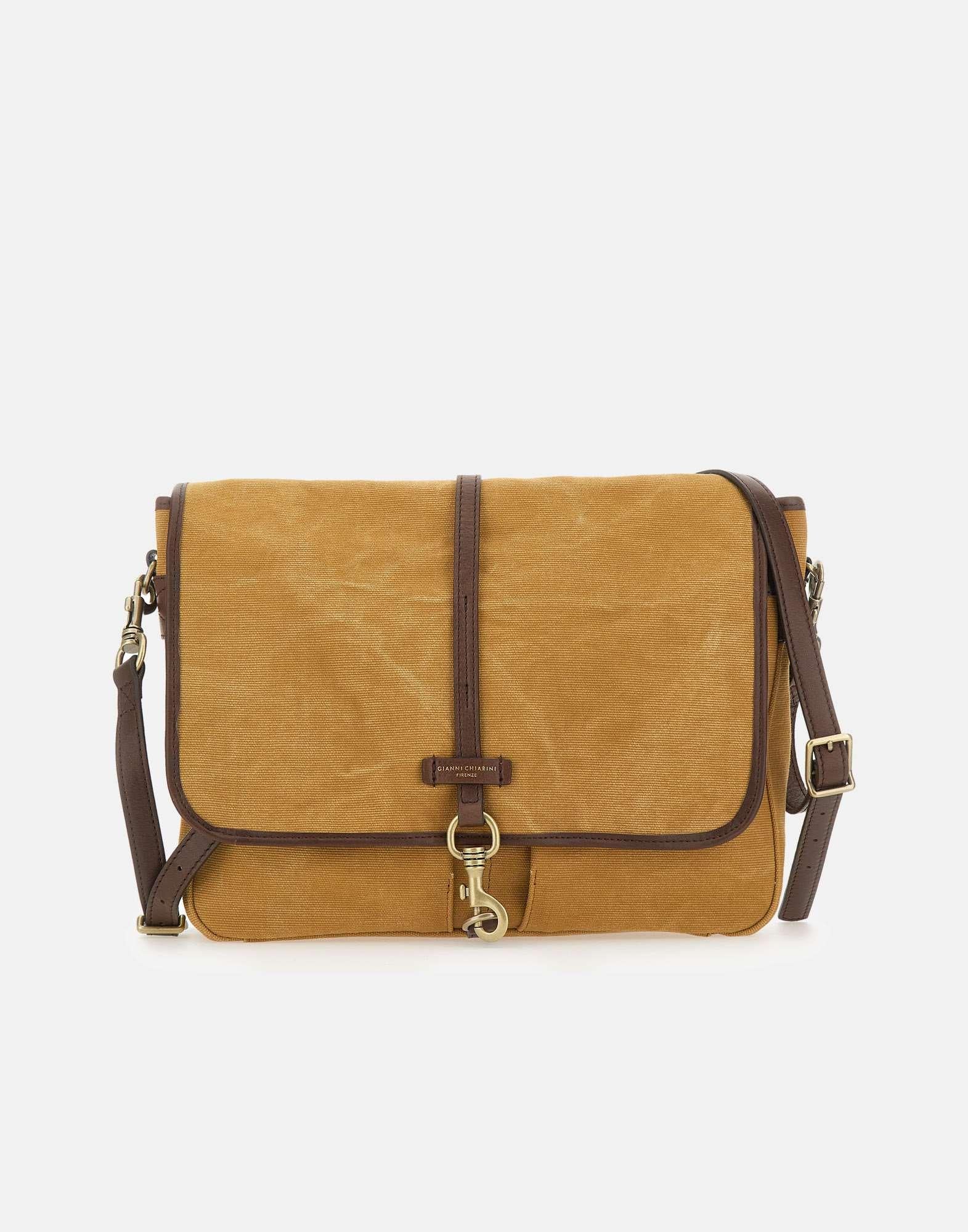 Gianni Chiarini "Berlino" crossbody bag crafted from tie dye stone washed canvas in camel color, finished with dark brown leather trims for a refined yet modern look. Features a flap closure with metal hook fastening. The adjustable and removable leather shoulder strap ensures versatile wear. Designed with two front snap-button pockets, the interior includes a large compartment and a zipped pocket for practical organization. Finished with a leather logo patch on the flap. Made in Italy. Dimensions: 37x10,5x31 cm.