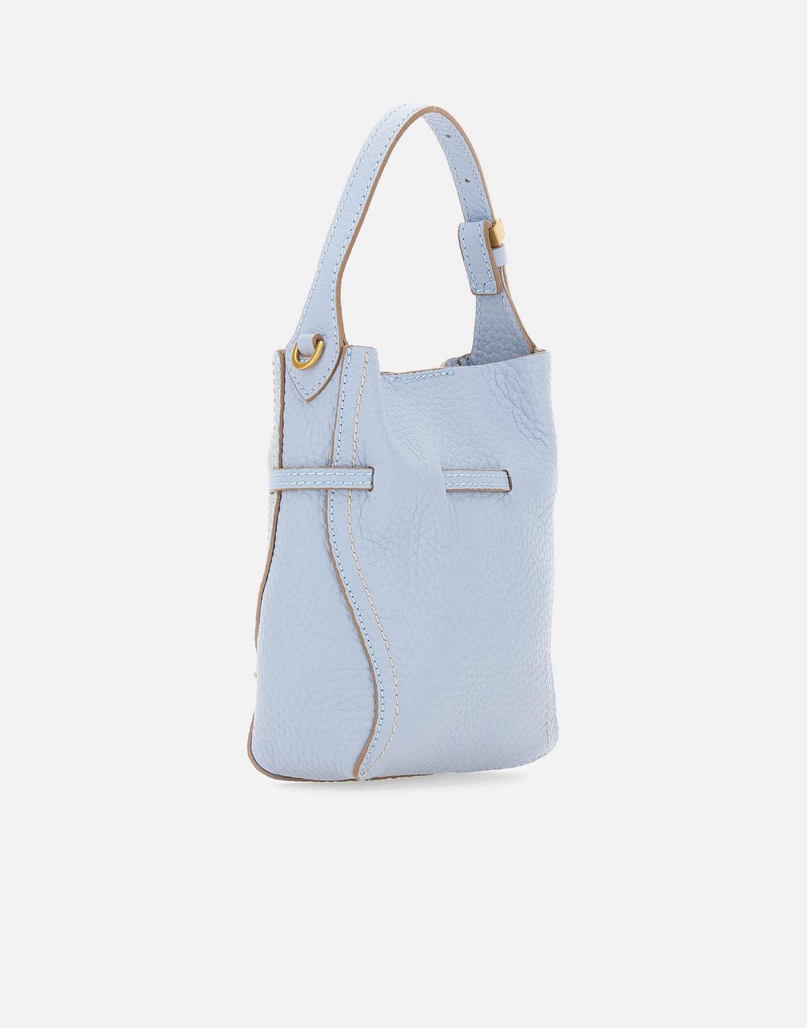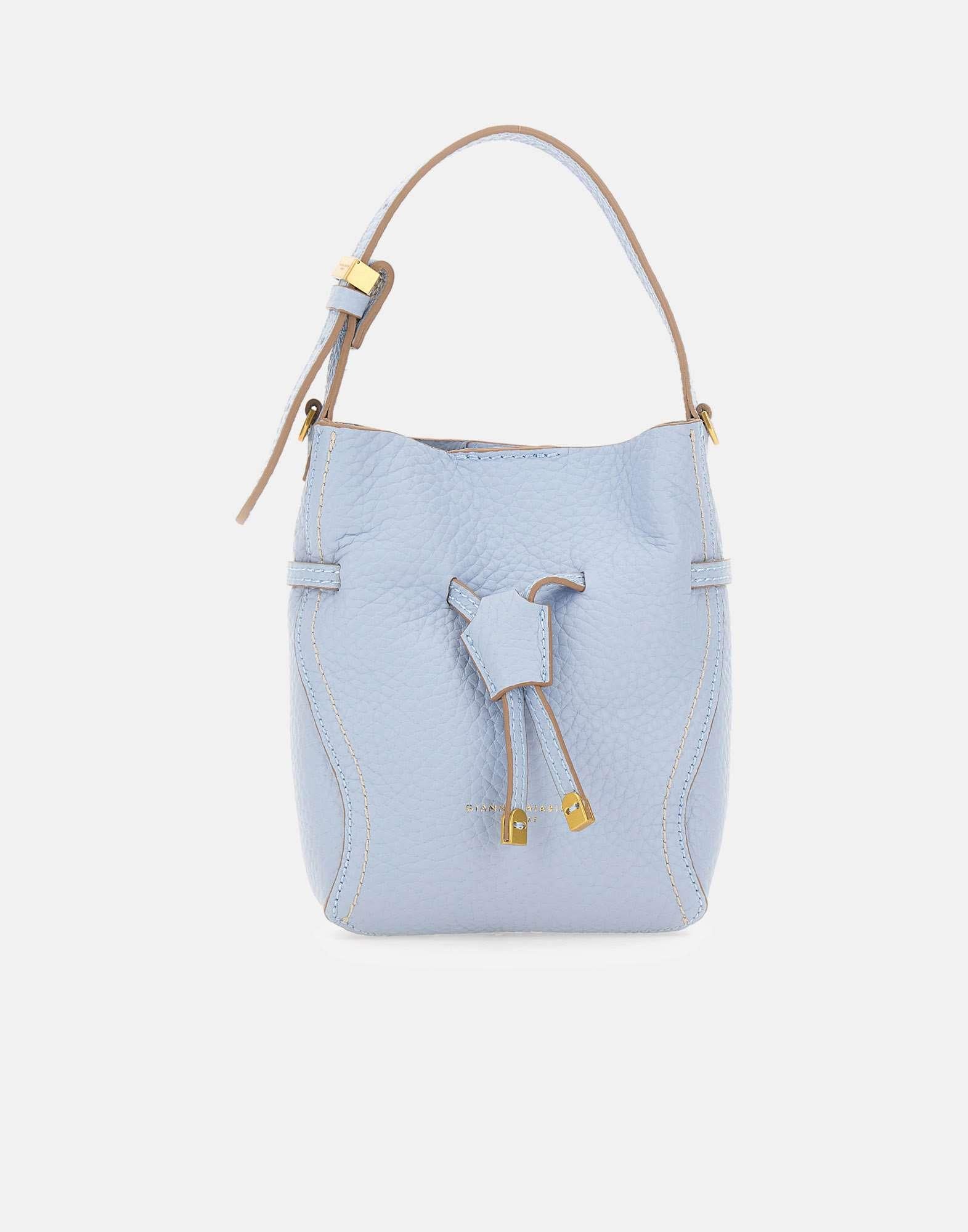 "Sienna" Gianni Chiarini women's handbag crafted from mid-blue grained leather, finished with contrast stitching that highlights the shape. Designed with a single compartment and a magnetic closure, it is enriched with signature gold-tone metal details, including the branded twin-loop keeper and metal tips. Carry it by hand or wear it crossbody thanks to the adjustable, removable strap included. Gold-tone printed logo on the front. Made in Italy. Size: 15x20x8 cm.