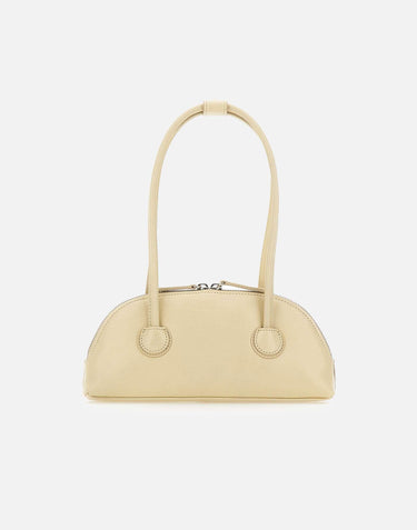 Mergesherwood "Bessette" women's shoulder bag crafted from cream leather, featuring a half-moon silhouette inspired by the '90s with a clean, modern feel. This bag is finished with an embossed logo on the front and a double-slider zip closure for everyday functionality. The two handles are secured with a snap button, offering a comfortable fit. Inside, it is completed with a branded lining. Comes with a dust bag. Size 26x12x4 cm, handle drop 20 cm.