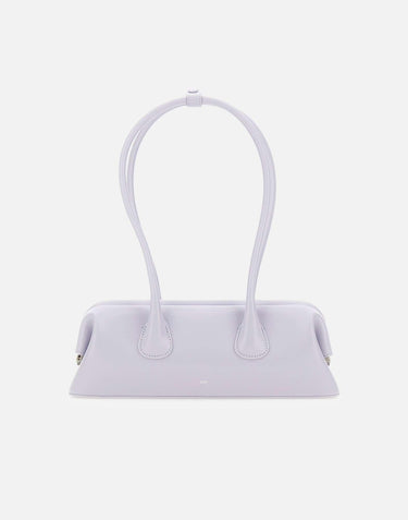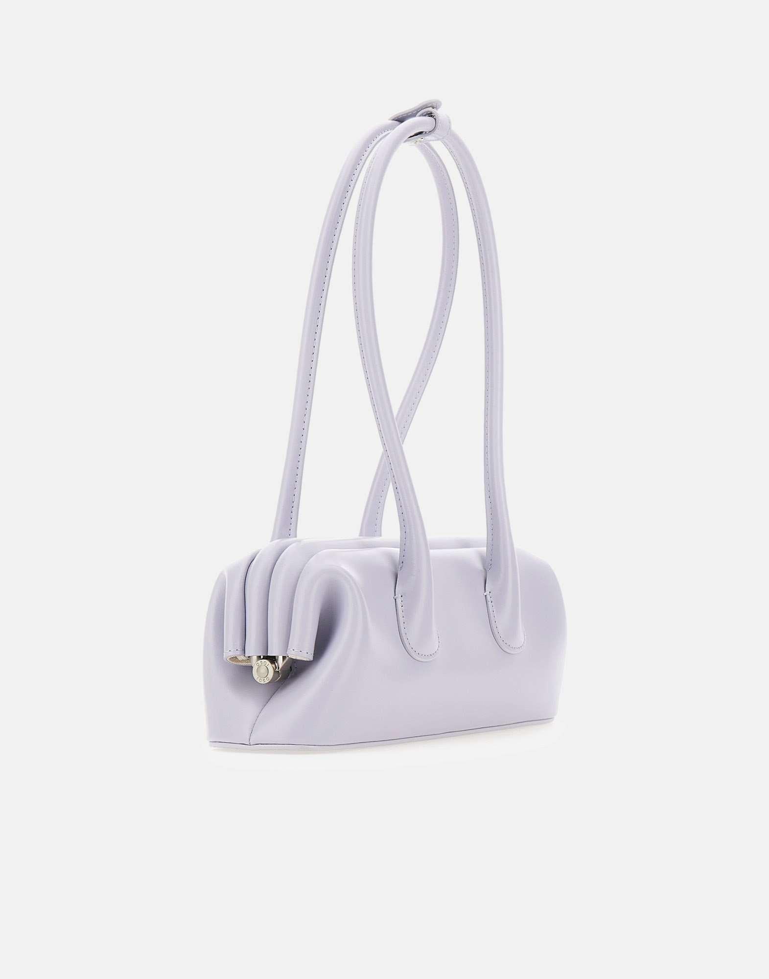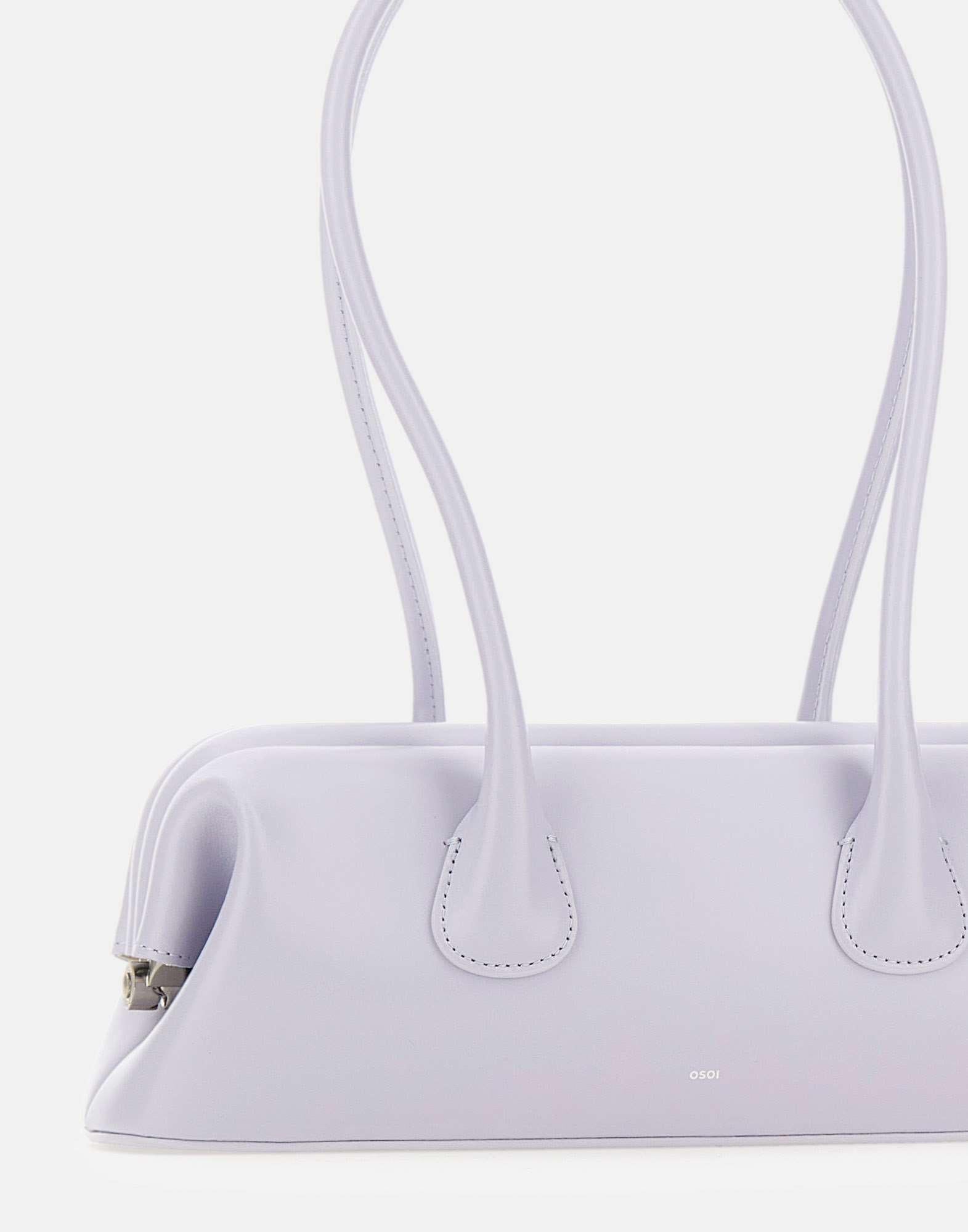Osoi "Boat Wide Mini" women's shoulder bag crafted from ice blue leather, defined by a snap opening and closure system that follows the bag's natural curved lines and frame structure. This shoulder bag features a timeless minimalist design, offering a comfortable wear and practical space for everyday essentials. The leather has a subtle sheen and feels soft to the touch when worn. Finished with two tubular handles secured with a snap button and an inner pocket for organization. Size 31x10x7 cm, handle drop 25.5 cm.