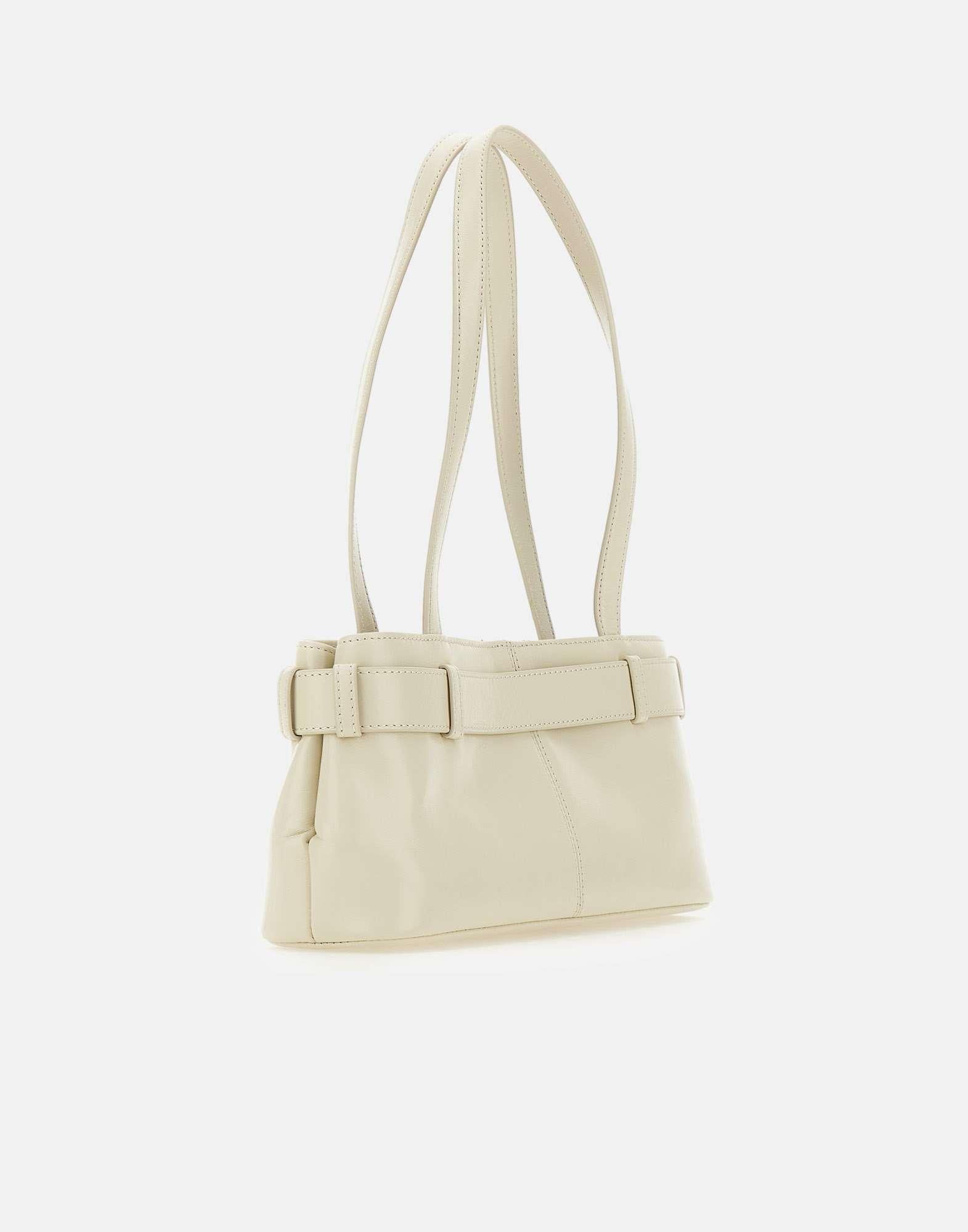 Osoi "Shoulder Brocle Mini" women's shoulder bag crafted from glossy-effect cream color leather, developed around the buckle concept, the signature element of the BROCLE series. This leather shoulder bag is defined by the buckled belt with metal details, and the OSOI key decoration on the front, creating a modern and distinctive look. It also can be personalized by attaching charms, keychains, and accessories to the additional ring provided. The main compartment is secured with a magnetic button and includes an inner pocket for organization. Finished with two top handles for a comfortable fit, it is a versatile bag that pairs easily with different styles. Dust bag included. Size 30-28x13.5x8 cm, handle drop 25 cm.