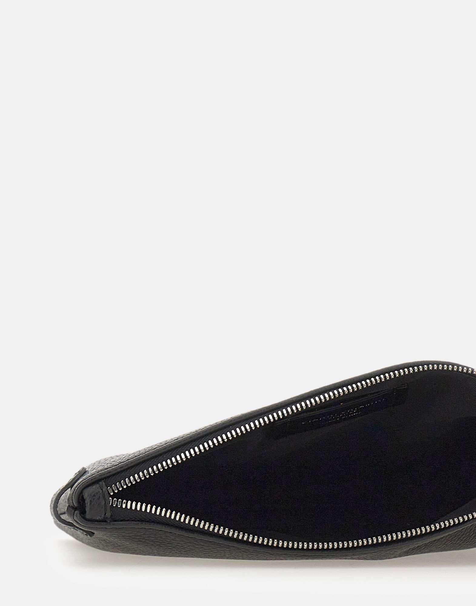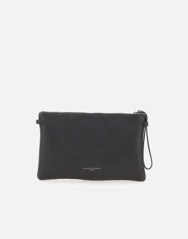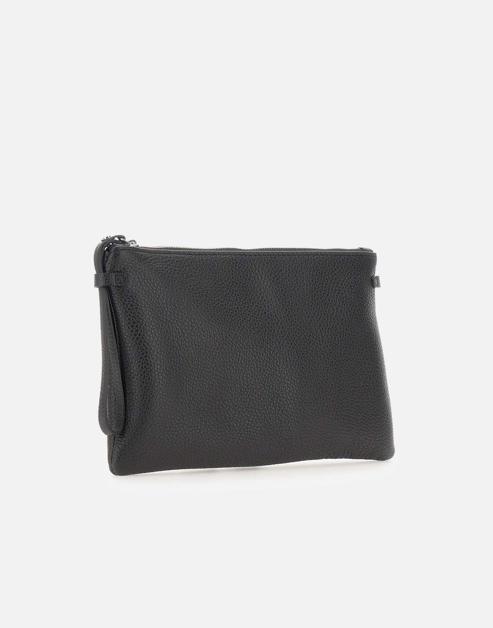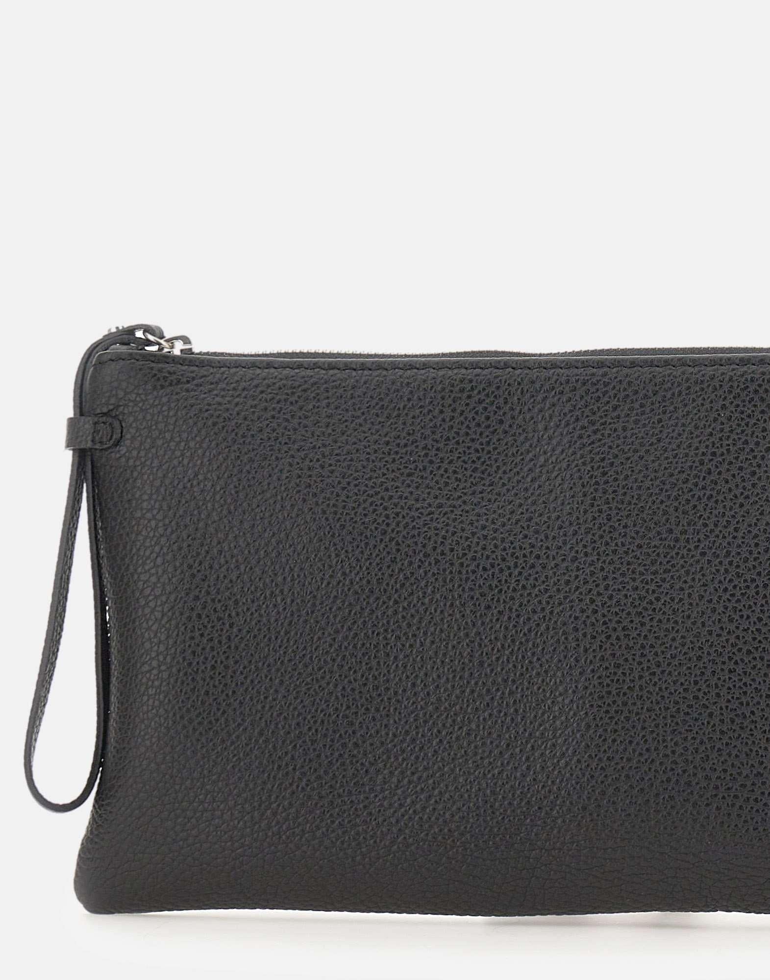 Gianni Chiarini Gianni Chiarini "Hermy" women's clutch bag in black hammered leather, a youthful and contemporary clutch designed to be carried by hand or on the wrist. The zip closure and contrasting zipper add a bold detail, while the wrist strap completes the look with a playful touch. The silver plating and external silver logo brighten the design. Featuring a thin, adjustable and removable shoulder strap of approximately 90 cm, it's ideal for both casual outfits and elegant evenings. Dust bag included. Made in Italy. Dimensions: 28 x 18 x 2 cm.