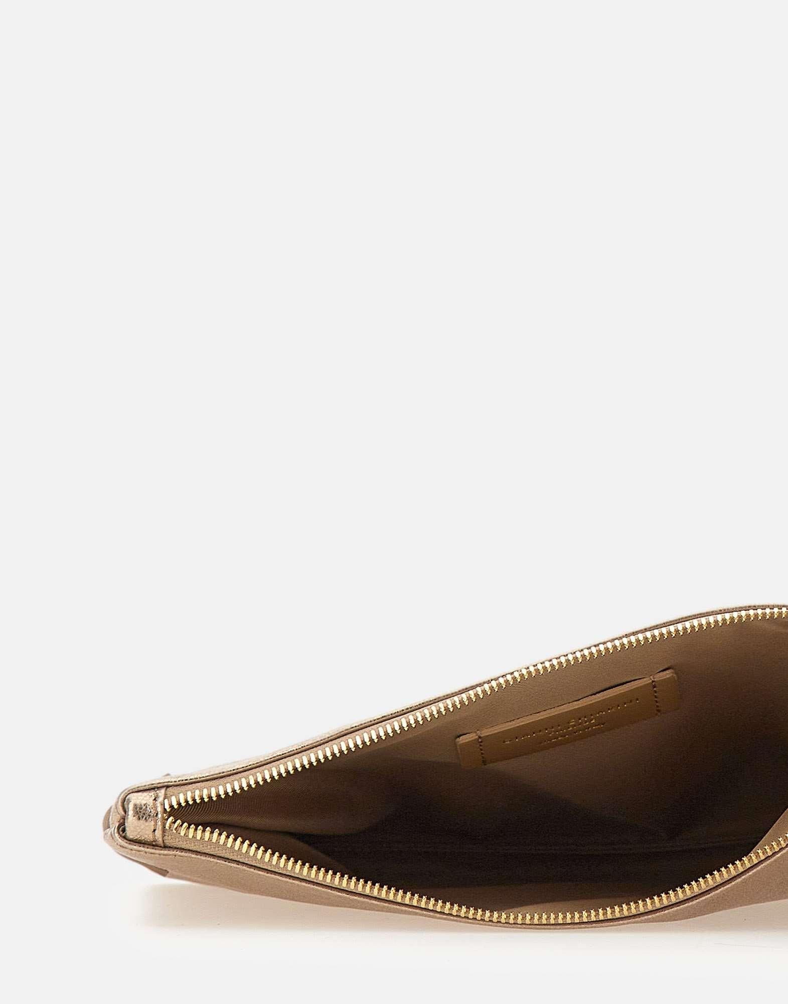 Gianni Chiarini women's pouch "Hermy" crafted from extra-light gold laminated-effect leather, designed to be lightweight and luminous. It features a top zip closure with a wristlet zipper pull, perfect to carry on the wrist. The removable strap allows crossbody wear while keeping a sleek, slim profile. Printed logo on the front. Dust bag included. Made in Italy. Size: 28x18x1 cm.