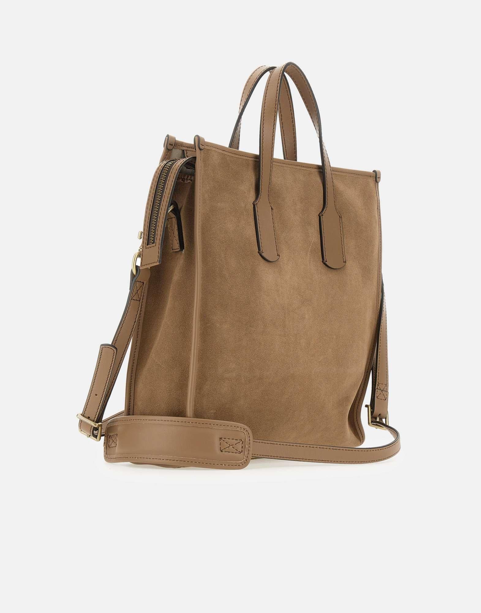 Gianni Chiarini men's hand bag "Berlino" crafted from suede leather in havana brown, finished with matching smooth leather trims and handles. The adjustable and removable leather shoulder strap offers an additional carrying option, making it suitable for any occasion. Top zip closure with a well-organized interior featuring two slip pockets and one zipped pocket. The front includes a large pocket with a branded snap-button and a leather logo patch. Size: 36.5x39x11 cm. Made in Italy.