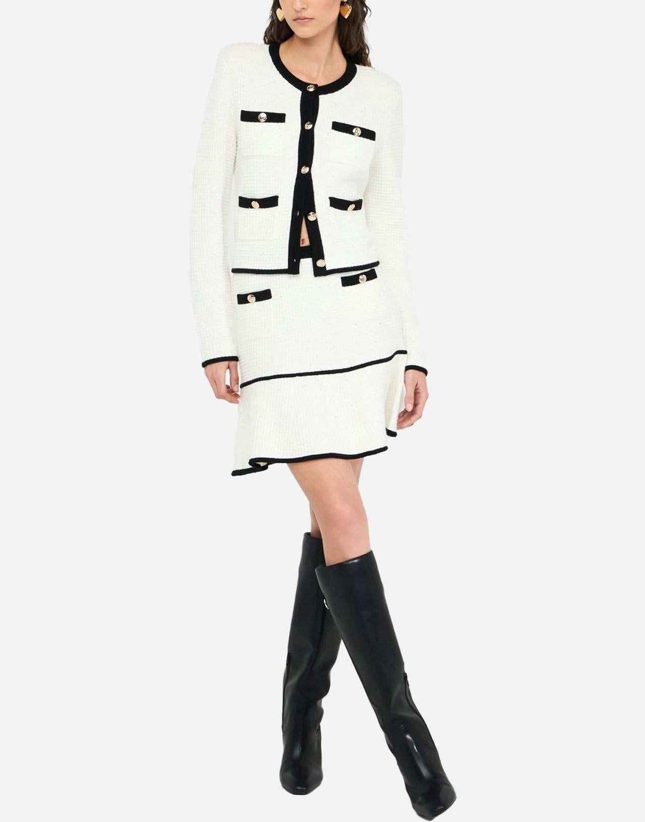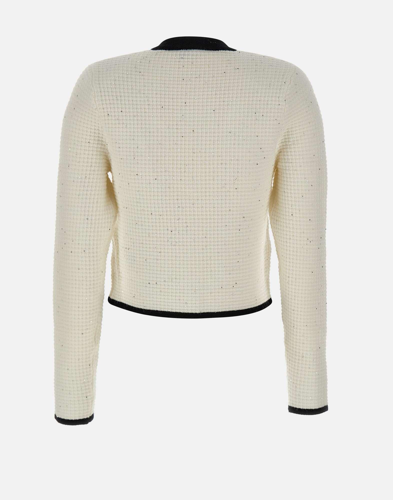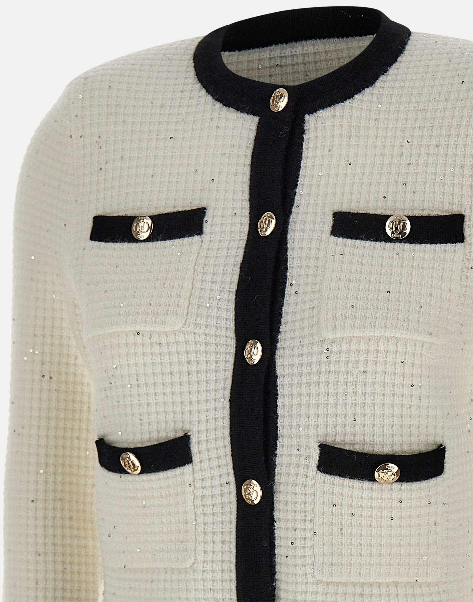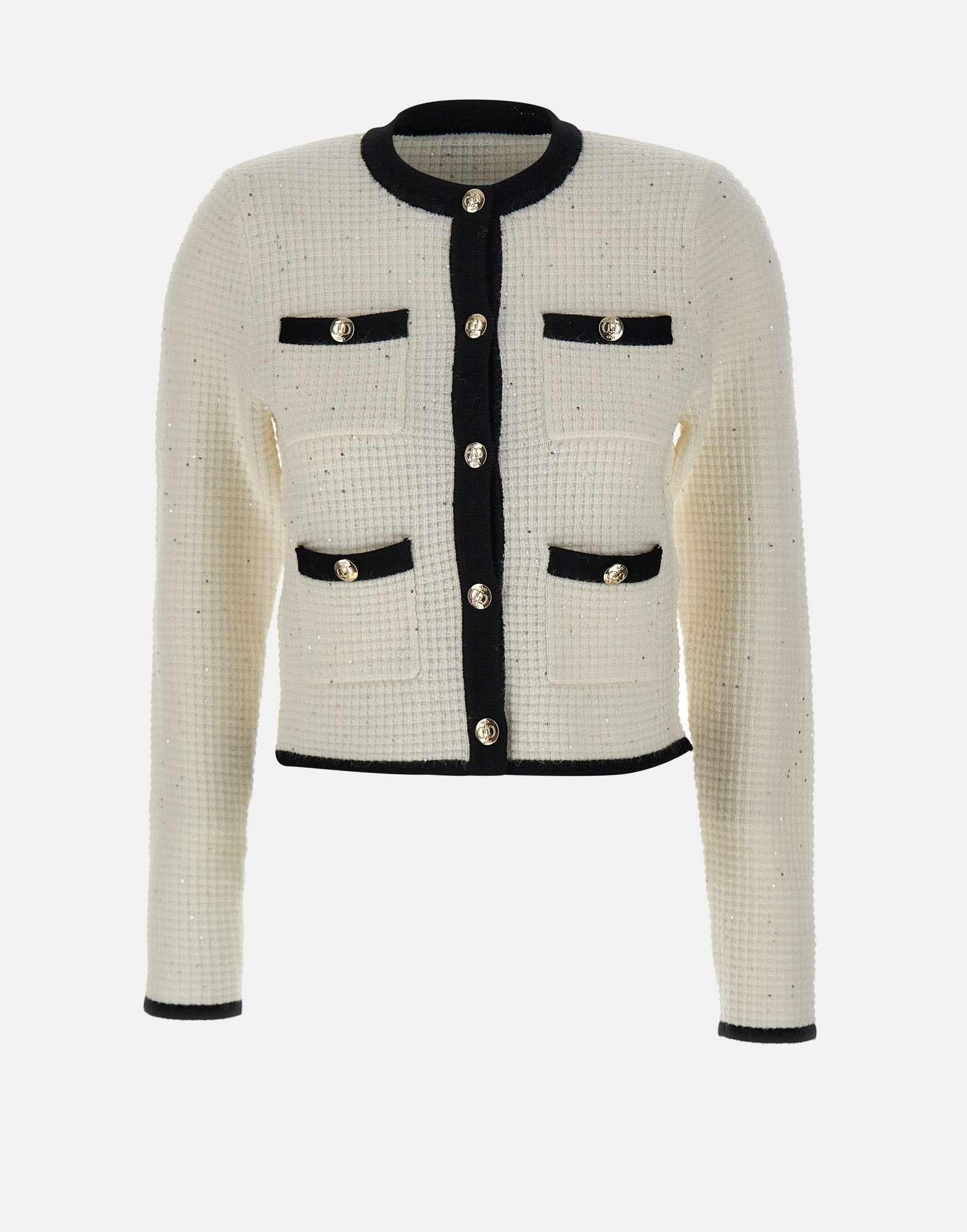 Elegant and luminous, this Liu-Jo women's jacket combines classic style with contemporary details. Crafted from a waffle-stitch knit with a viscose and lurex blend, it stands out for its sophisticated black and white contrast and slightly shiny finish. The design features a clean crew neck, decorative breast pockets, and front pockets, all embellished with gold logo buttons that match central closure. Part of sustainable "Liu Jo Better" line, this jacket combines fashion with environmental responsibility.