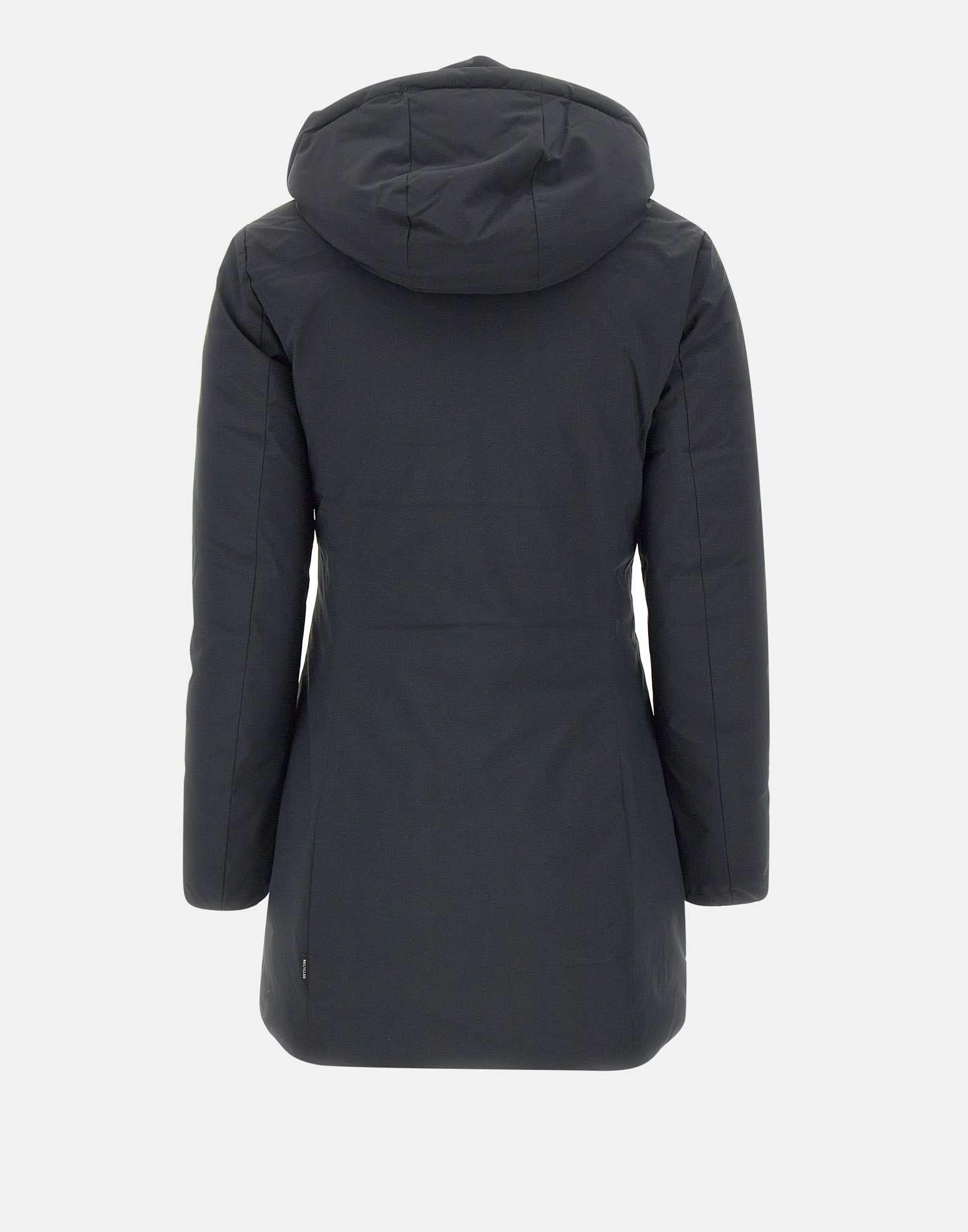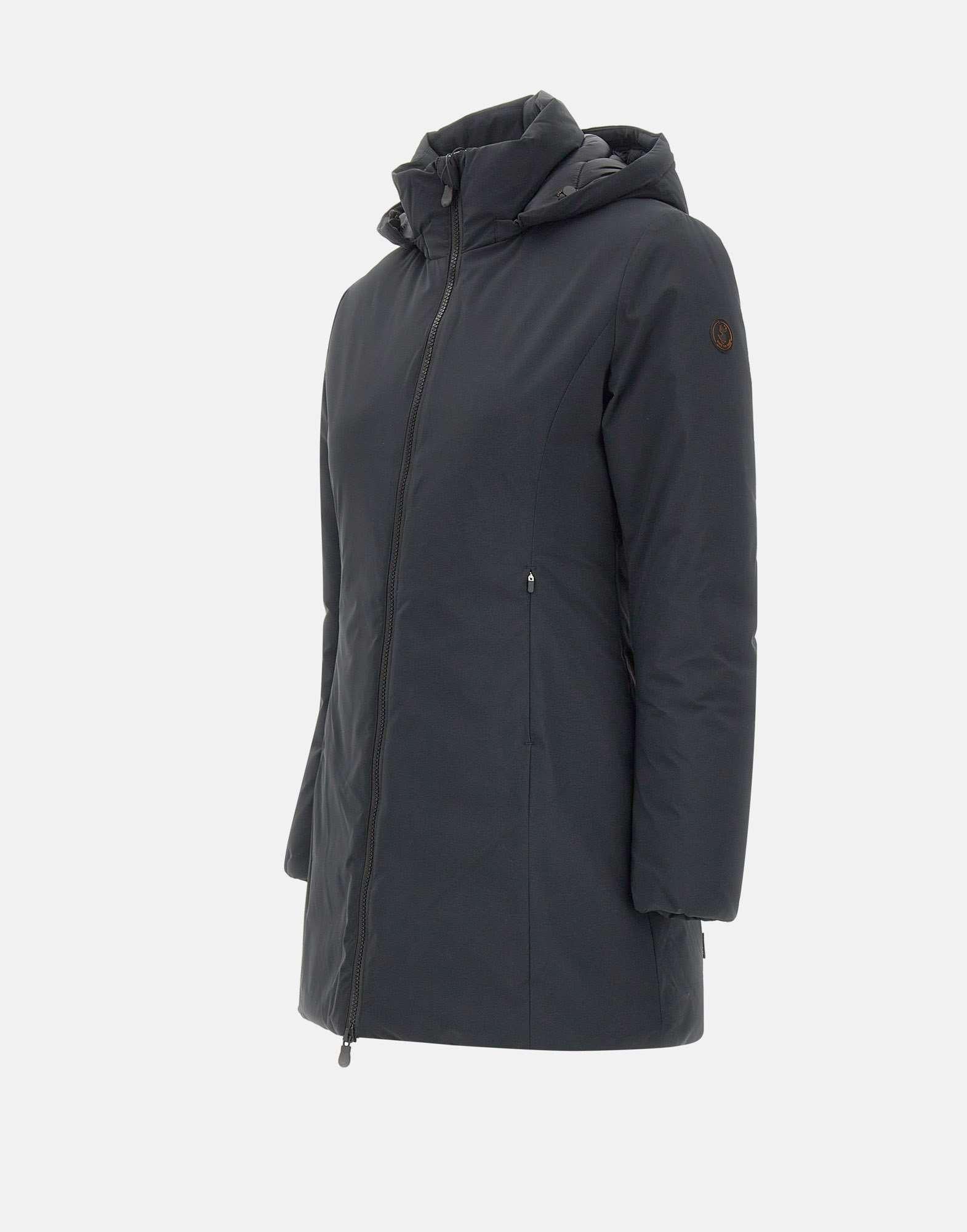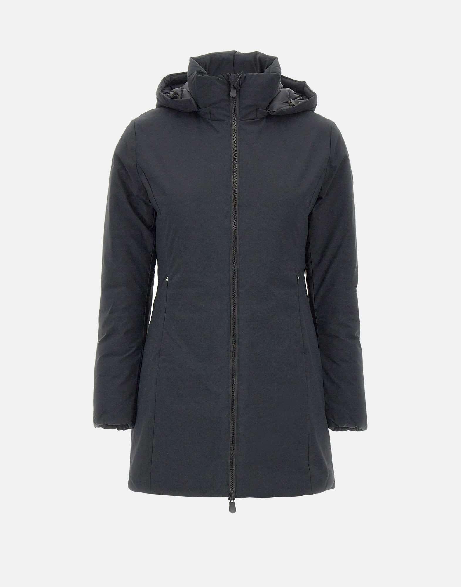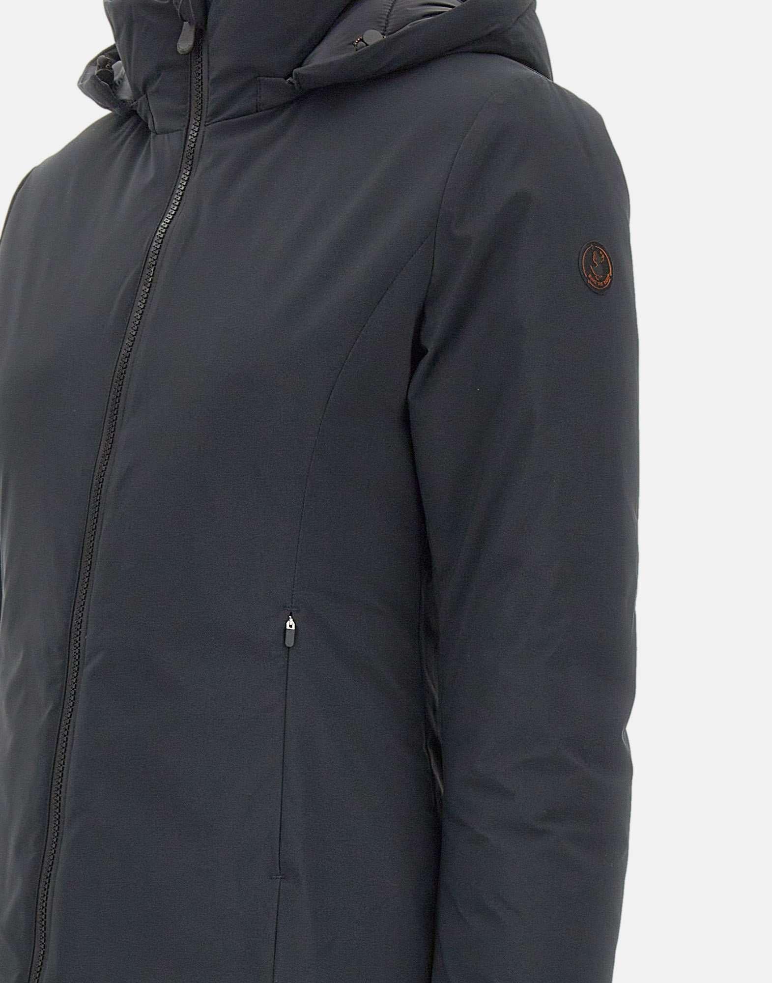 Save The Duck "Matt21Rachel" women's parka, black, made with 100% animal-free Plumetech padding, warm and lightweight. Features a removable hood with drawstring, double-slider zip front closure and side pockets with zip closure. Elasticated cuffs provide optimal protection from cold, while logo patch on left sleeve adds a distinctive touch. Slim fit, perfect for a functional and contemporary style.