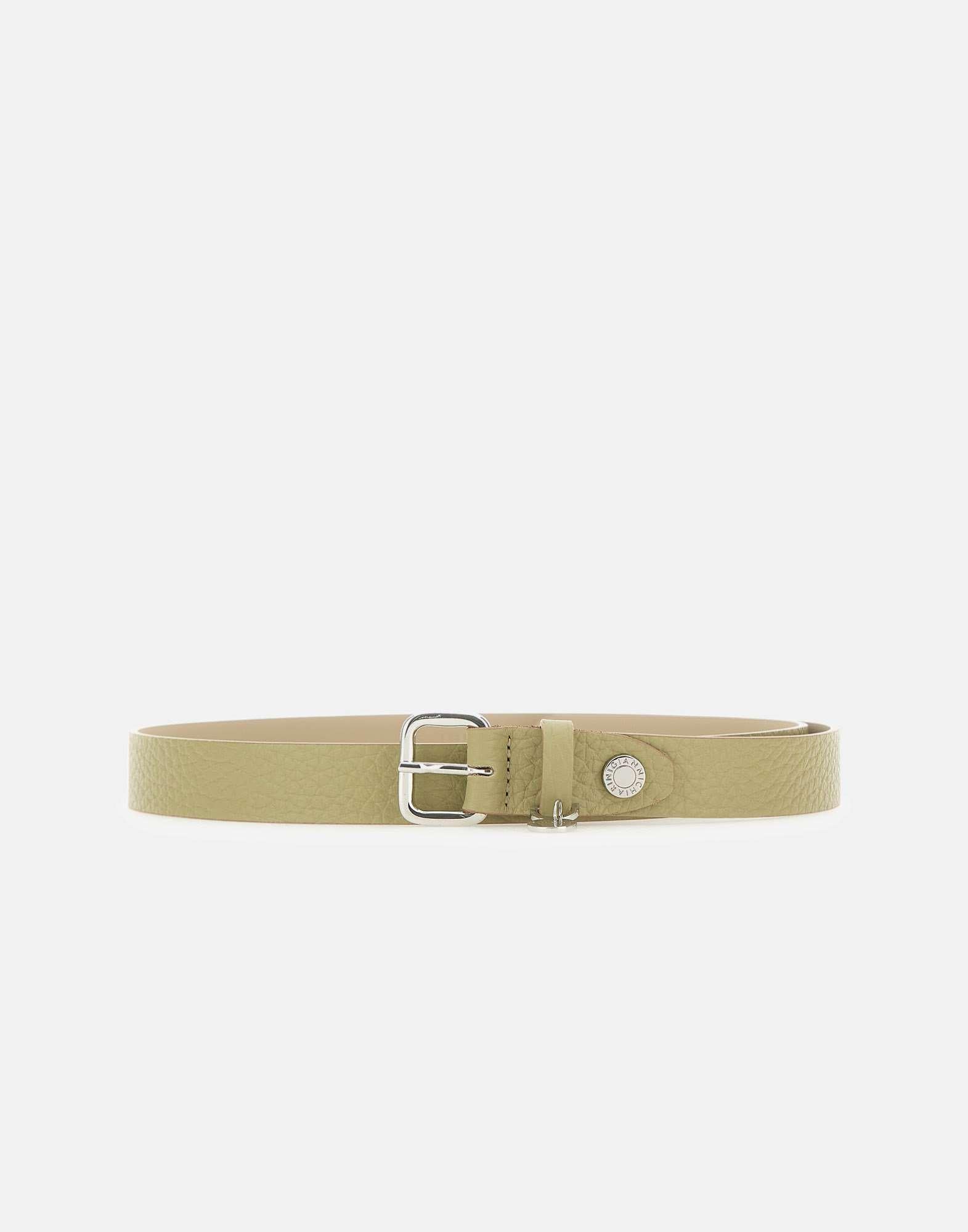 Gianni Chiarini women's maxi-grain leather belt in a sage green shade. Designed with a flat, clean silhouette and simple, essential lines, it is perfect for completing both casual and more elegant looks. The 2.5 cm width makes it versatile and easy to style, while the square silver-tone buckle adds a contemporary touch. A small logo charm embellishes the buckle for a subtle signature detail. One size. Made in Italy.