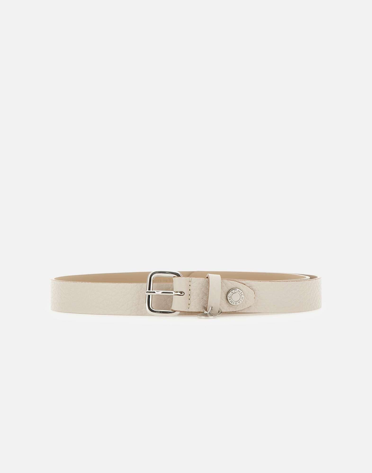Gianni Chiarini women's maxi-grain leather belt in a cream shade. Designed with a flat, clean silhouette and simple, essential lines, it is perfect for completing both casual and more elegant looks. The 2.5 cm width makes it versatile and easy to style, while the square silver-tone buckle adds a contemporary touch. A small logo charm embellishes the buckle for a subtle signature detail. One size. Made in Italy.