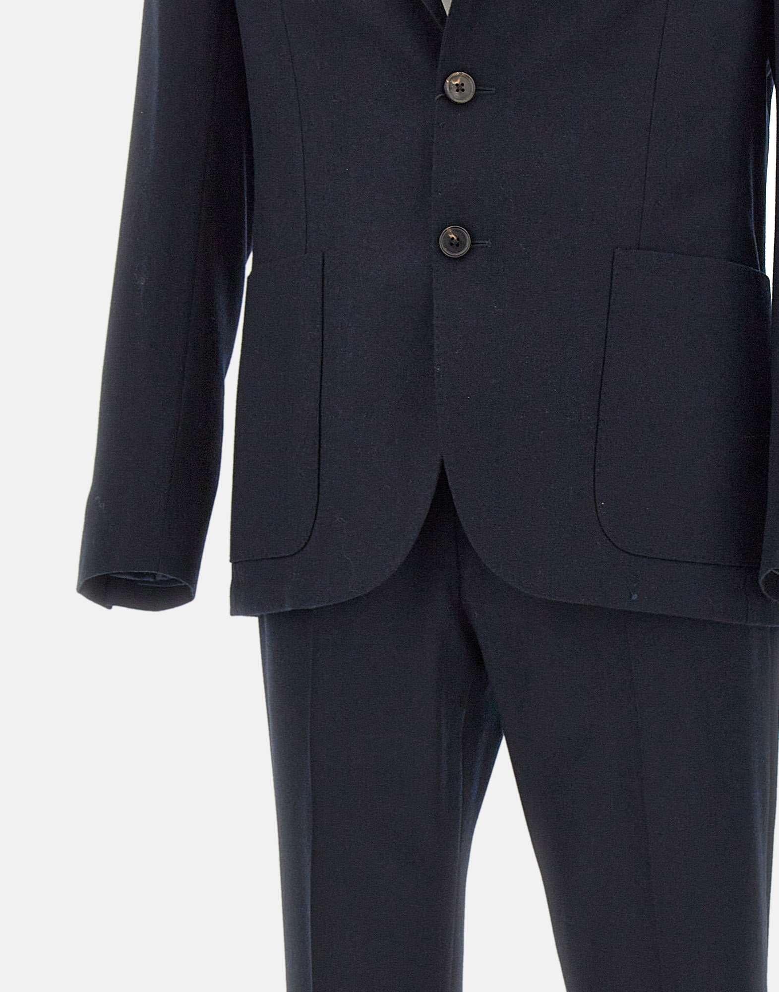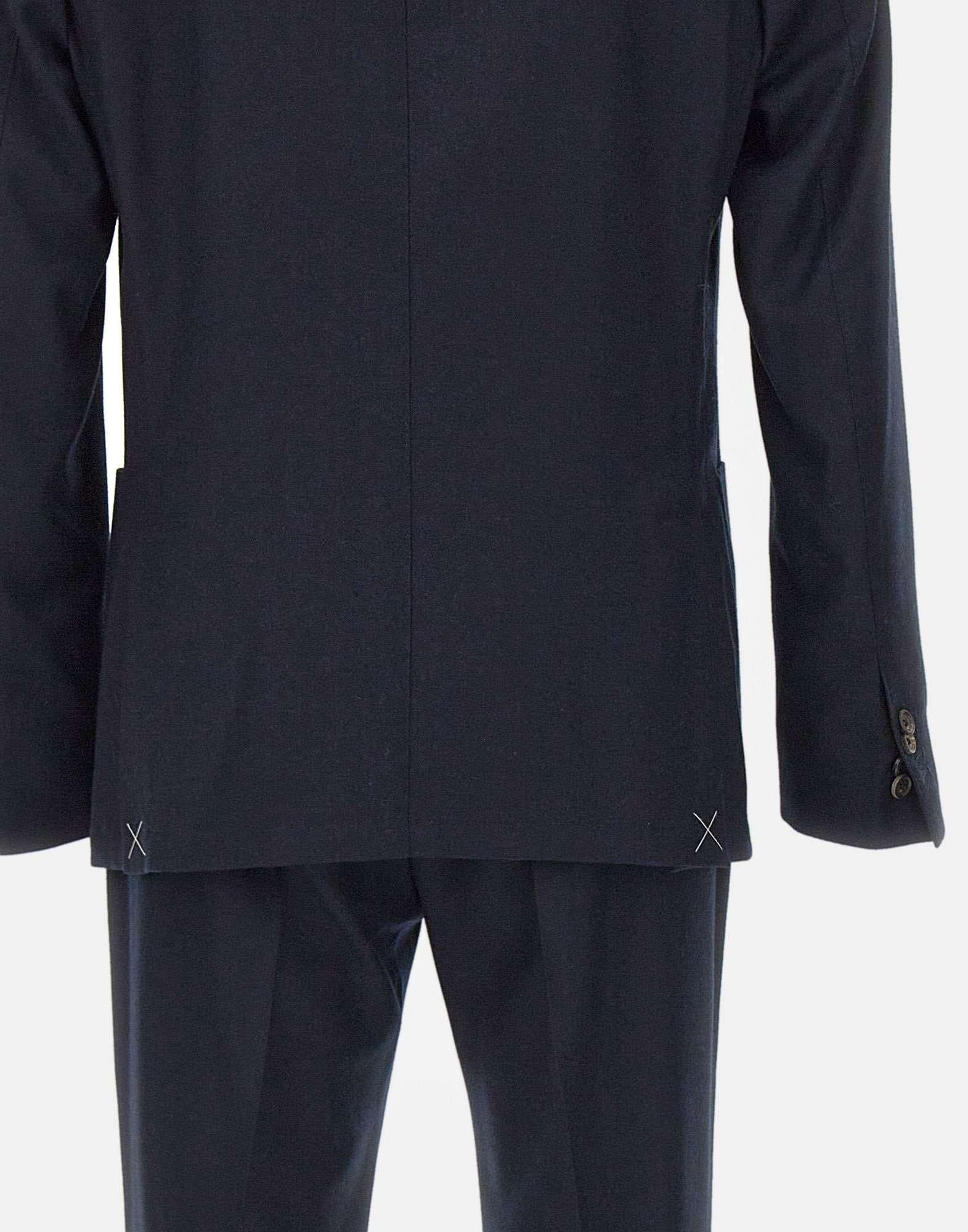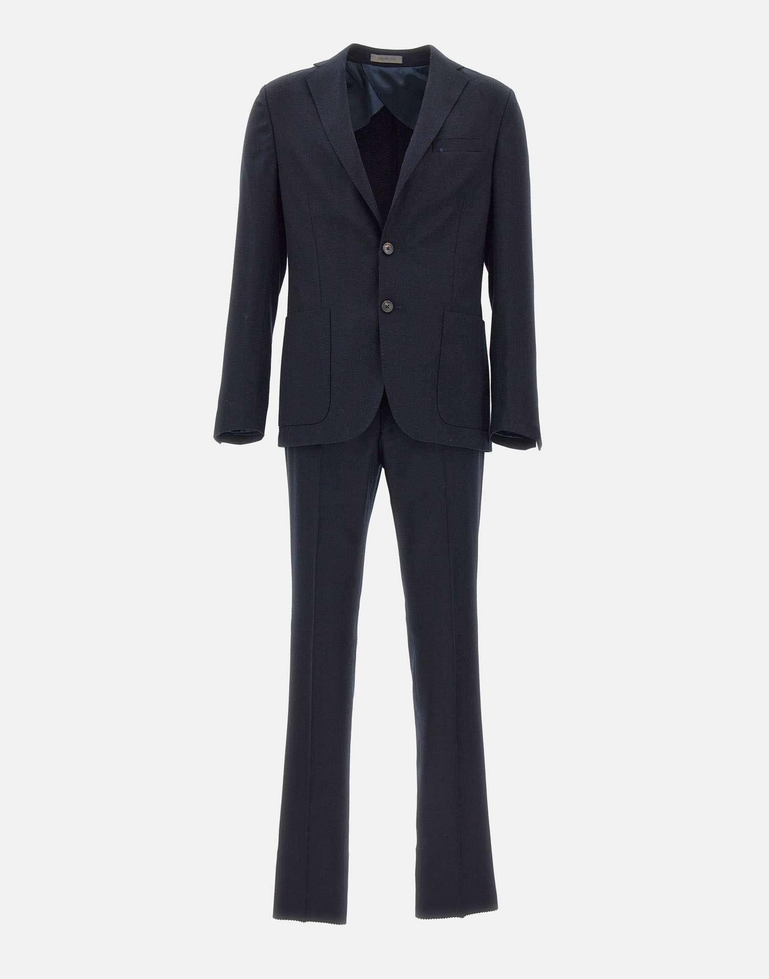 Mens Corneliani two-piece suit in washable navy blue wool, combining refined tailoring with everyday practicality. The blazer features narrow lapels, a two-button closure, front flap pockets, a chest pocket, buttoned cuffs, double rear vents, and lined interior with pockets. The trousers include a zip and button closure, side welt pockets, single back pockets with button, a regular waist with belt loops, and a straight leg with 18 cm hem. Finished with a scalloped hem and slim fit Drop 7R, it offers contemporary elegance and comfort.