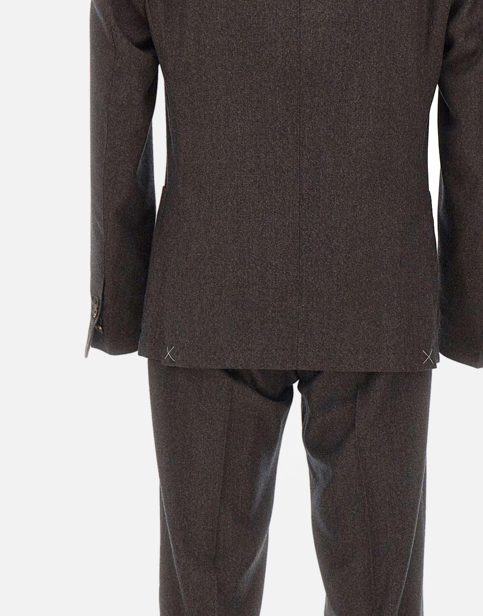 Corneliani men's two-piece suit in burnt brown wool with shades of gray and blue, Washable, practical and refined, ideal for everyday elegance without sacrificing comfort. The blazer features narrow lapels, a two-button closure, front flap pockets, a chest pocket, buttoned cuffs, side vents at the back, and an internal lining with pockets. The trousers, with zip and button closure, feature side welt pockets, single-welt back pockets with buttons, a regular waist with belt loops, and a straight leg with an 18 cm hem. Finished with a scalloped hem and a slim fit (Drop 7R), it represents the perfect balance between tailoring and functionality.