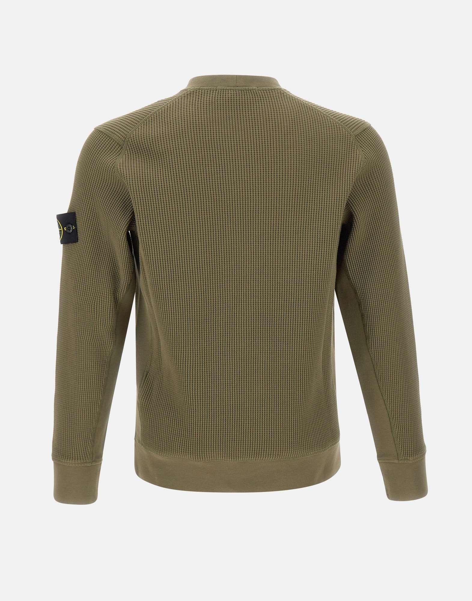 Stone Island men's sweatshirt crafted from military green organic cotton with a honeycomb texture, designed as a crew-neck style with a refined technical construction. It features raglan sleeves on the back, rib-knit side and underarm inserts, and overlock stitching for a clean, functional finish. Ribbed trims complete the silhouette. Heavy weight, ideal for colder-season layering. Finished with the iconic Stone Island badge on the left sleeve. Regular fit.