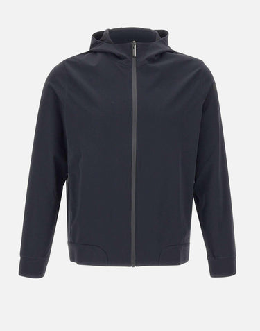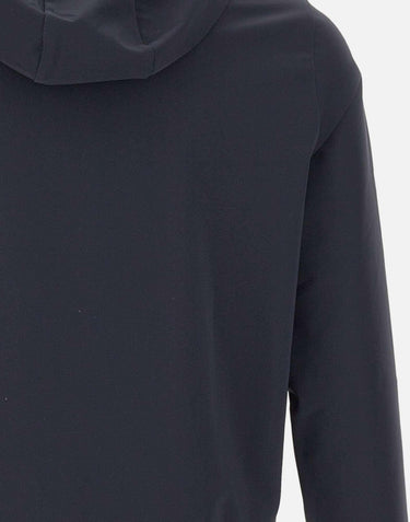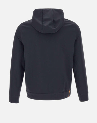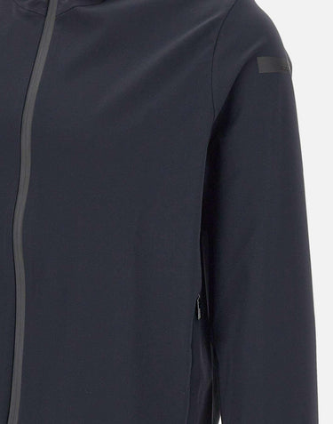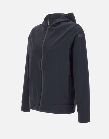 The RRD "Surflex Winter Hood Zip Fleece" men's jacket in navy blue features a minimalist design and a matte finish. Crafted from wrinkle-resistant, wind- and rain-resistant SURFLEX® stretch fabric, it offers a smooth feel and exceptional comfort, making it ideal for transitional weather. It features a fixed hood, a front zip fastening, and side pockets with invisible zips. Its sleek fit and clean lines create a functional, urban style, complemented by a black micro-injected logo on the left sleeve.