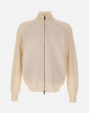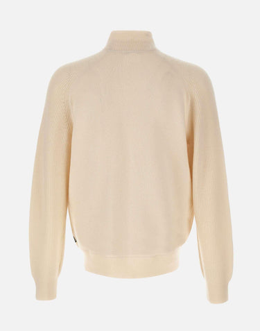Mens BOSS "H-Hibisco" sweater crafted from a two-tone mixed fabric wool in ivory. Features a stand-up collar, full-zip closure, side welt pockets, and ribbed trims for a refined finish. The dropped shoulders and relaxed fit create an effortless yet sophisticated silhouette, ideal for versatile everyday wear.