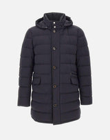 Moorer "Kalandri KN" blu notte, unisce eleganza sartoriale e tecnologia performante. Realizzato in tessuto bielastico resinato idrorepellente, compatto e resistente, fa parte della linea Acqua (1 ombrellino), ideale per affrontare pioggia e freddo. Il design monopetto a linea dritta, trapuntato in piuma doca per un comfort termico superiore, presenta stacchino trapuntato e cappuccio removibili, chiusura con bottoni in corno, tasche anteriori con pattina e tasche interne funzionali. Un capo raffinato, sinonimo delleccellenza Made in Italy, progettato per garantire una thermal experience da -12°C a +8°C.