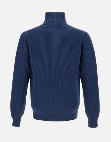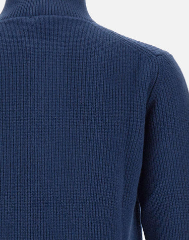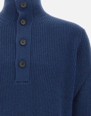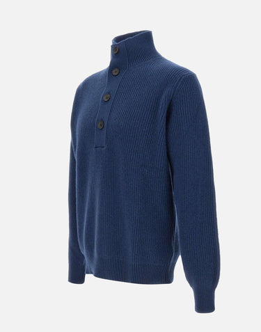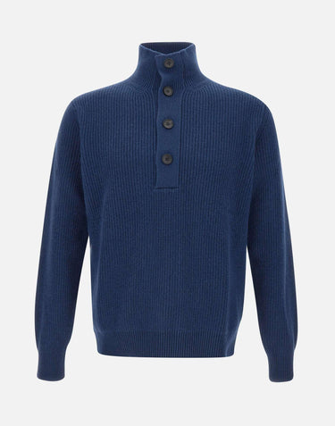 Filippo De Laurentiis men's ink blue superfine wool and cashmere knit sweater, long sleeves, stand-up collar, half-closure with horn buttons, ribbed edges, regular fit, made in Italy