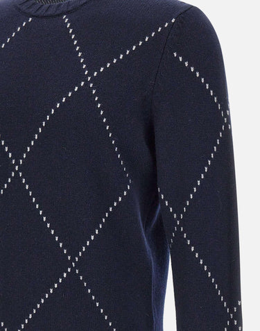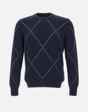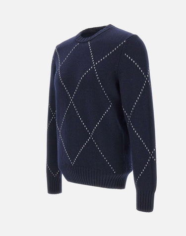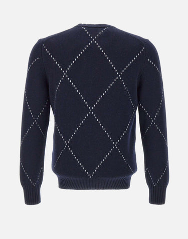 Gran Sasso men's cashmere and wool sweater, blue, diamond pattern with contrasting colors, Luxury Collection, long sleeves, crew neck, ribbed edges, regular fit, made in Italy