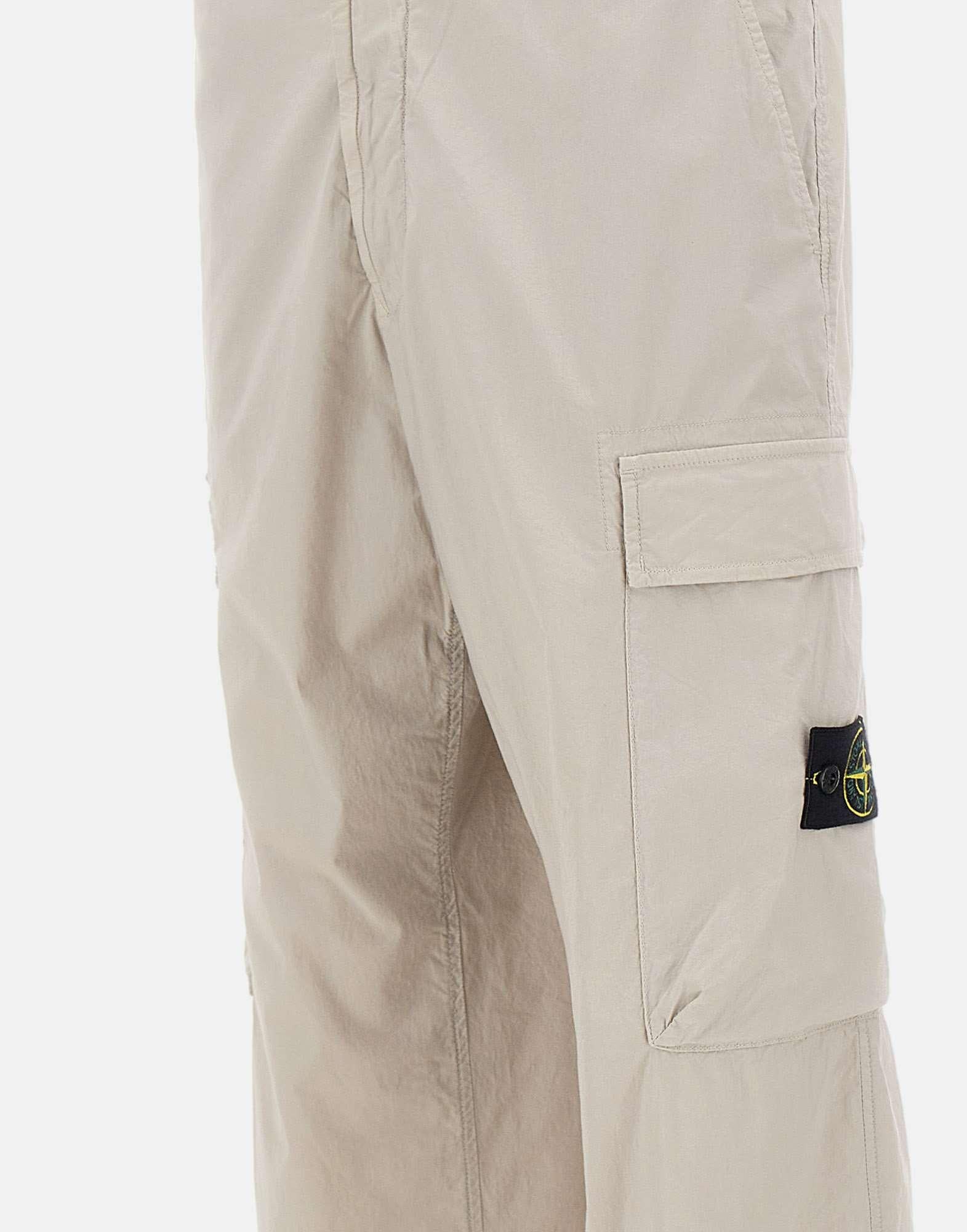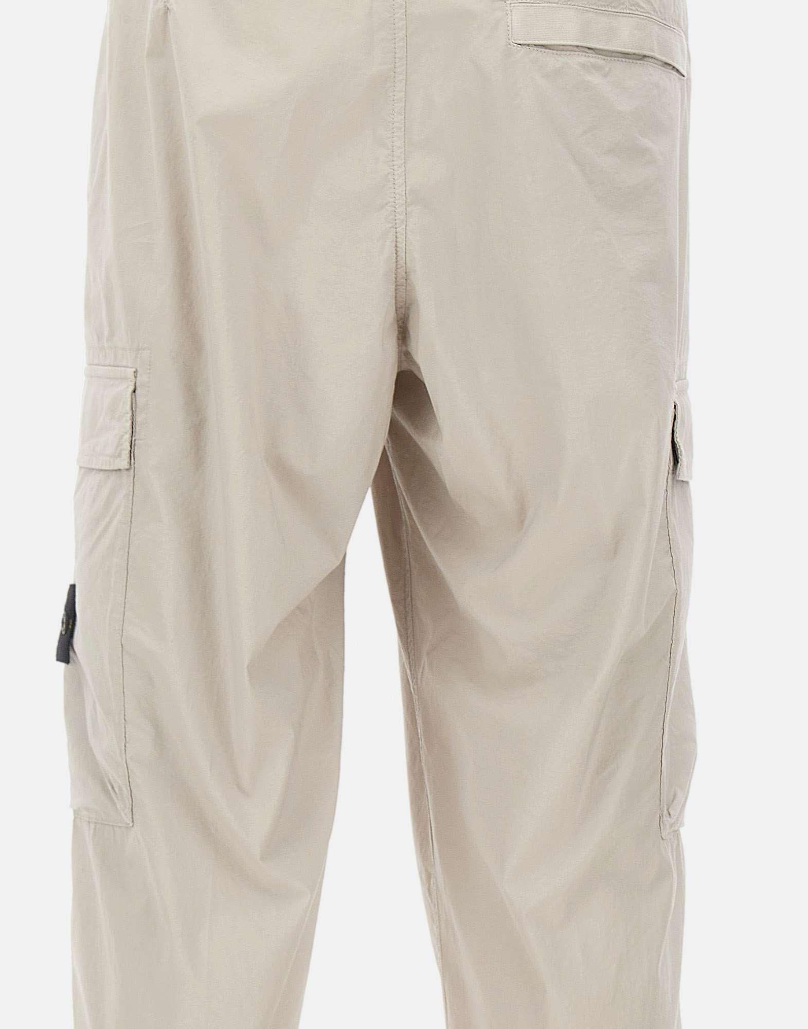 Stone Island men's trousers crafted from beige lightweight stretch cotton canvas "Paracadute", in a cargo version with a loose fit and a garment-dyed finish. Designed with slanted front pockets, gusseted cargo pockets with flap and three concealed snap buttons, and a back pocket with fixed tape flap and concealed snap button. Stone Island badge on the left cargo pocket. Button fastening with a zip-fly flap, plus an internal drawstring at the hem for adjustable styling. Bottom width: 22 cm. Loose fit.