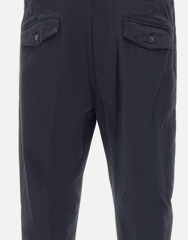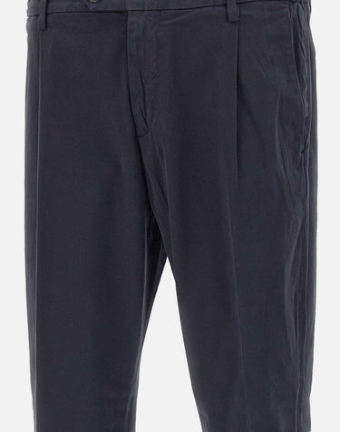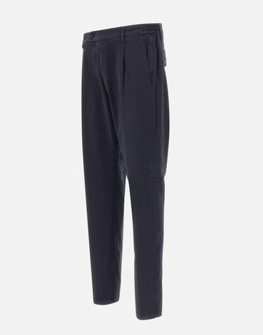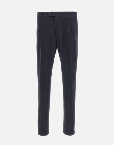 Eleventy men's blue stretch cotton trousers, with a partially elasticated waist, single dart, belt loops, zip and button closure, back flap pockets with button, side welt pockets, straight leg with 18cm hem, slim fit. Made in Italy