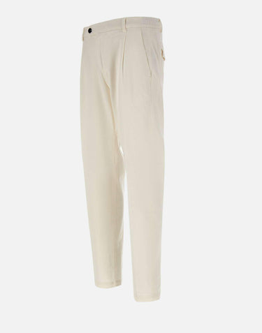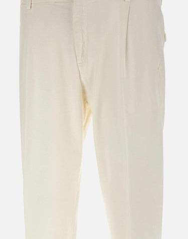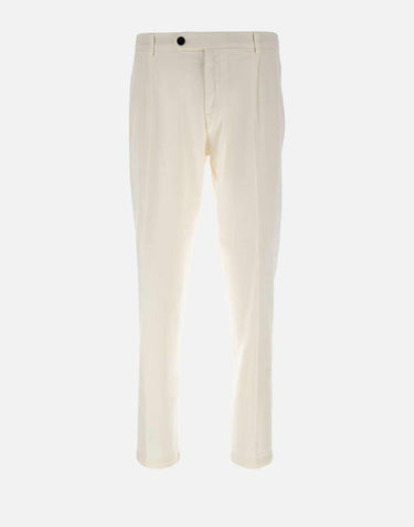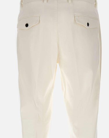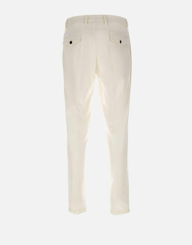 Eleventy men's milk white stretch cotton trousers, partially elasticated waist, single dart, belt loops, zip and button closure, back flap pockets with button, side welt pockets, straight leg with 18cm hem, slim fit. Made in Italy