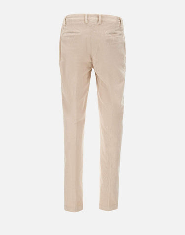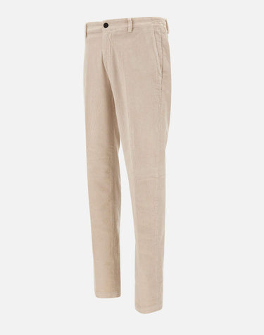 Eleventy men's beige stretch corduroy trousers, with a partially elasticated waist, belt loops, zip and button closure, single-welt back pockets, side slit pockets, straight leg with 18cm hem, slim fit. Made in Italy