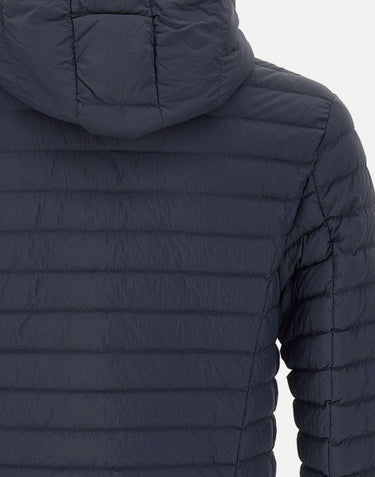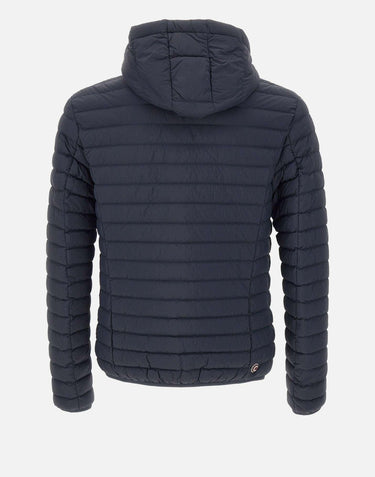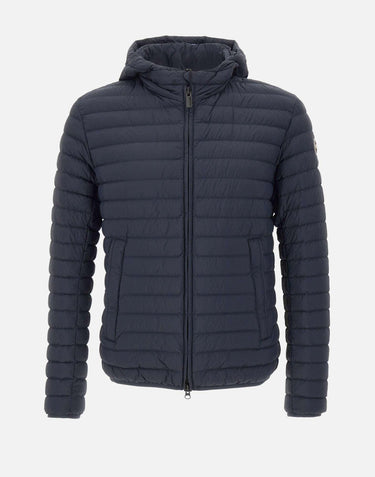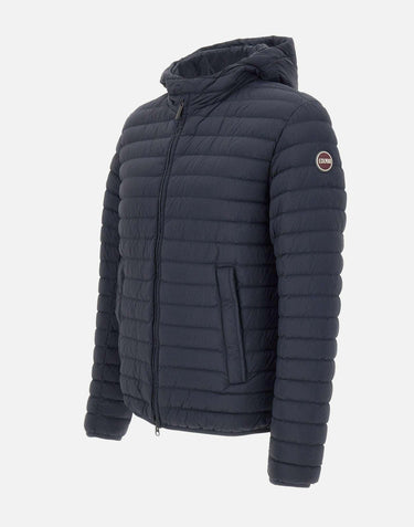 Colmar Originals lightweight men's down jacket “Mindset” blue, 100 grams, 100% eco-sustainable polyamide fabric, fixed hood, side pockets with zips, drawstring at hem, RDS-certified natural down filling, water-repellent, double-slider zip closure, internal pocket, iconic rubberized logo on left sleeve and back, horizontal quilting, regular fit.