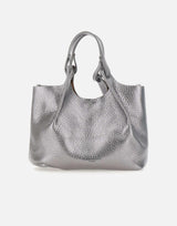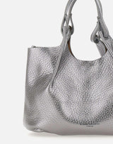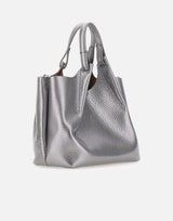Borsa a mano Gianni Chiarini "Dua" in pelle grana maxi, color silver e interno cuoio, doppio manico superiore, chiusura con magnete, logo argento esterno, tracolla removibile inclusa 90cm, pochette inclusa, metalleria silver. Dimensioni: lunghezza 24cm alla base, altezza 27cm, profondità 12cm. Made in Italy.