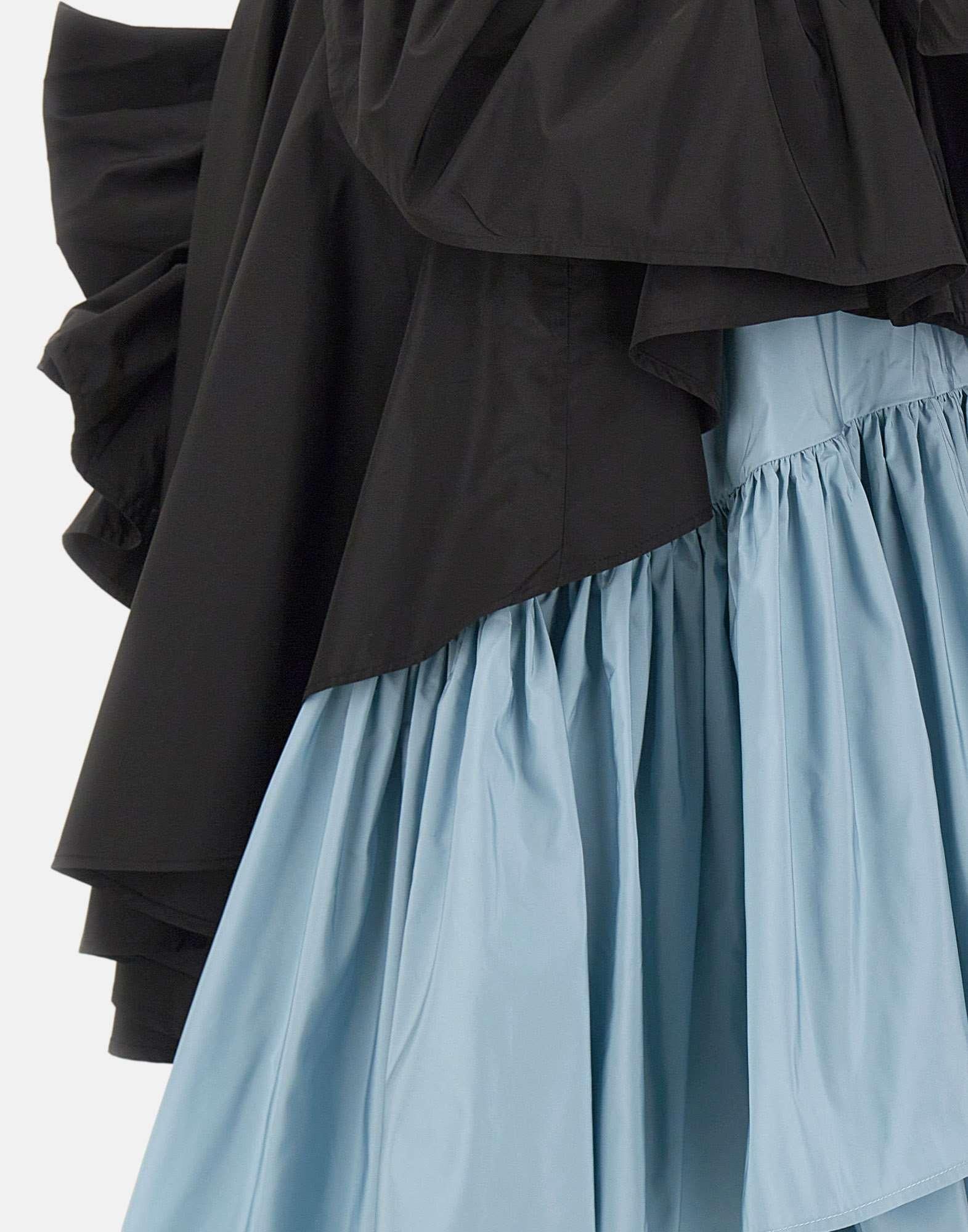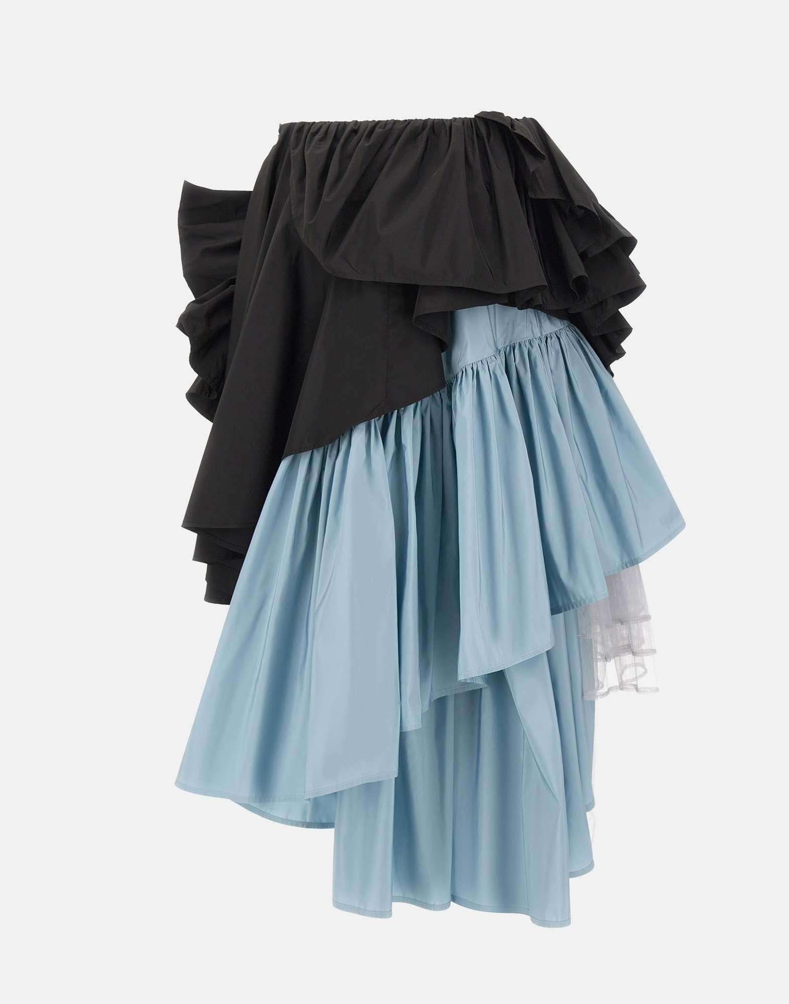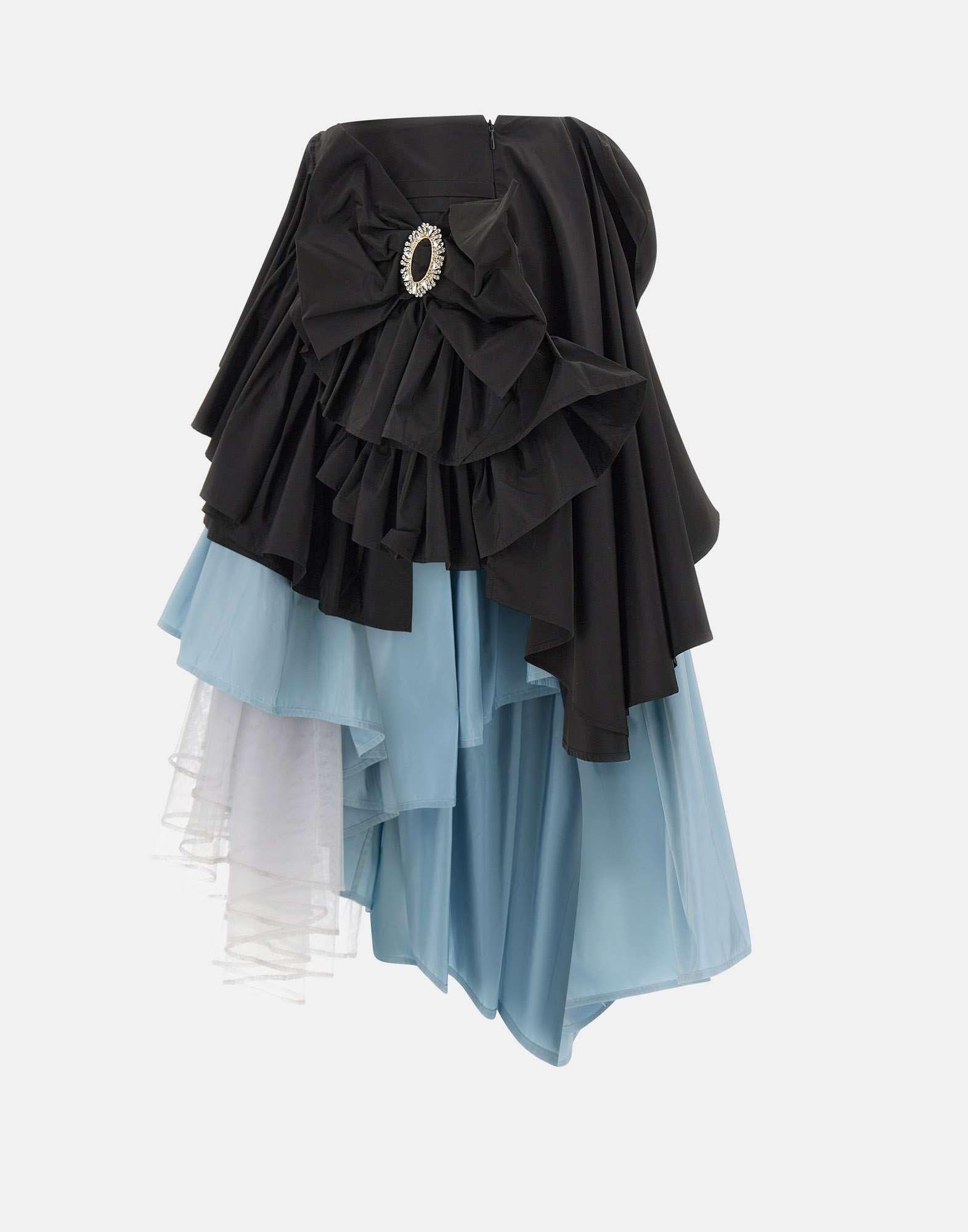 Vaquera women's skirt crafted from taffeta with gathered layers in black and light blue tones, enhanced by a white tulle insert that adds volume and structure. The design is embellished with a maxi bow with rhinestones on the side, while the asymmetrical cut, shorter on the left and longer on the right, creates a dynamic and statement silhouette. The tiered construction emphasizes the voluminous and refined look. Hidden side zip closure.
