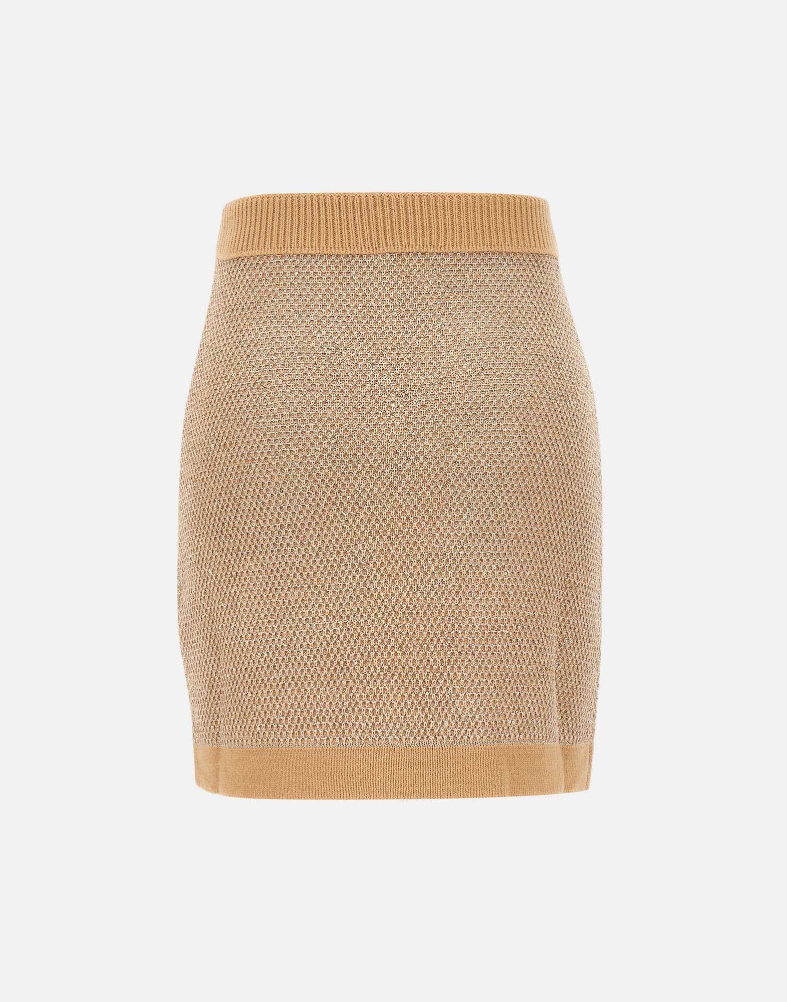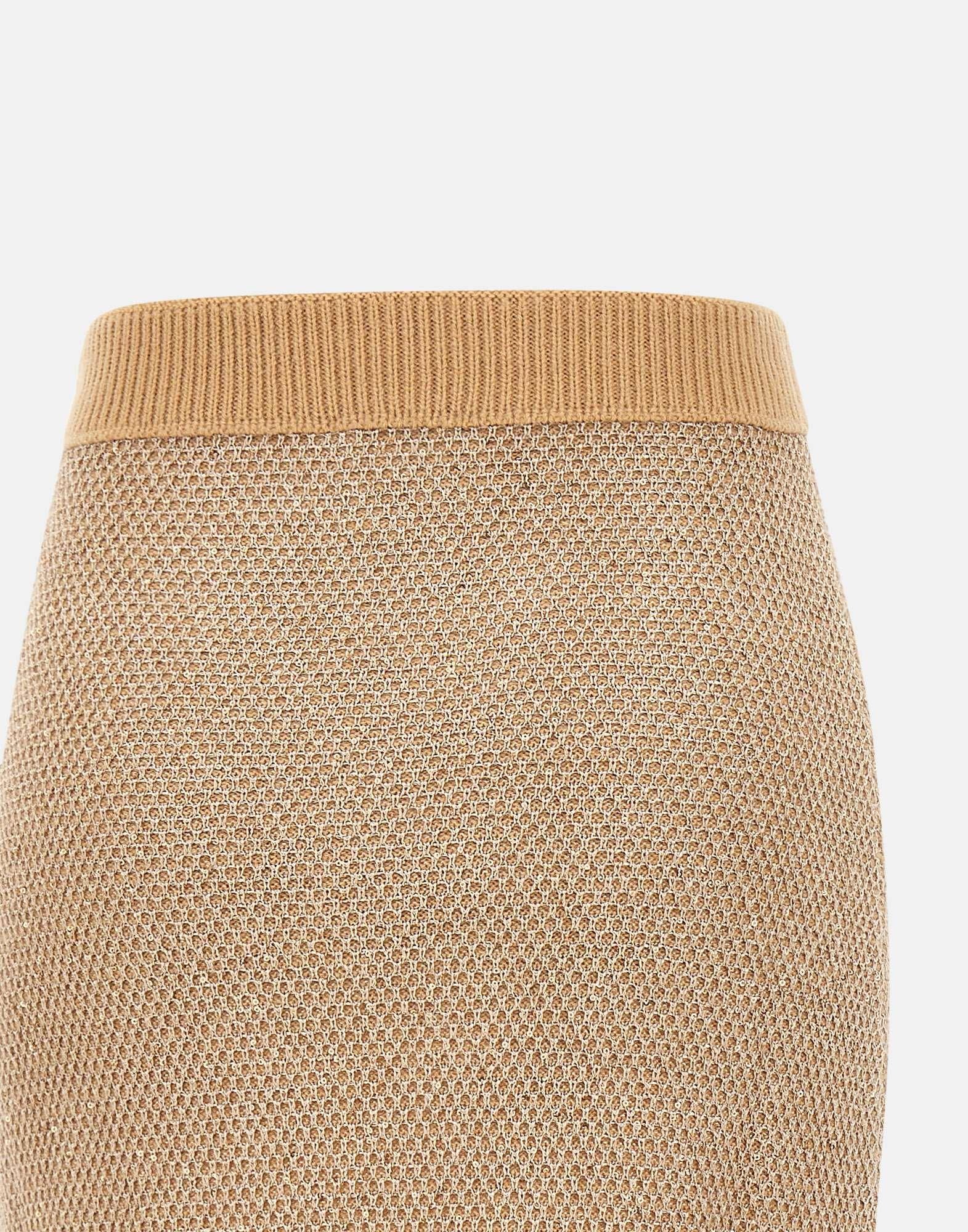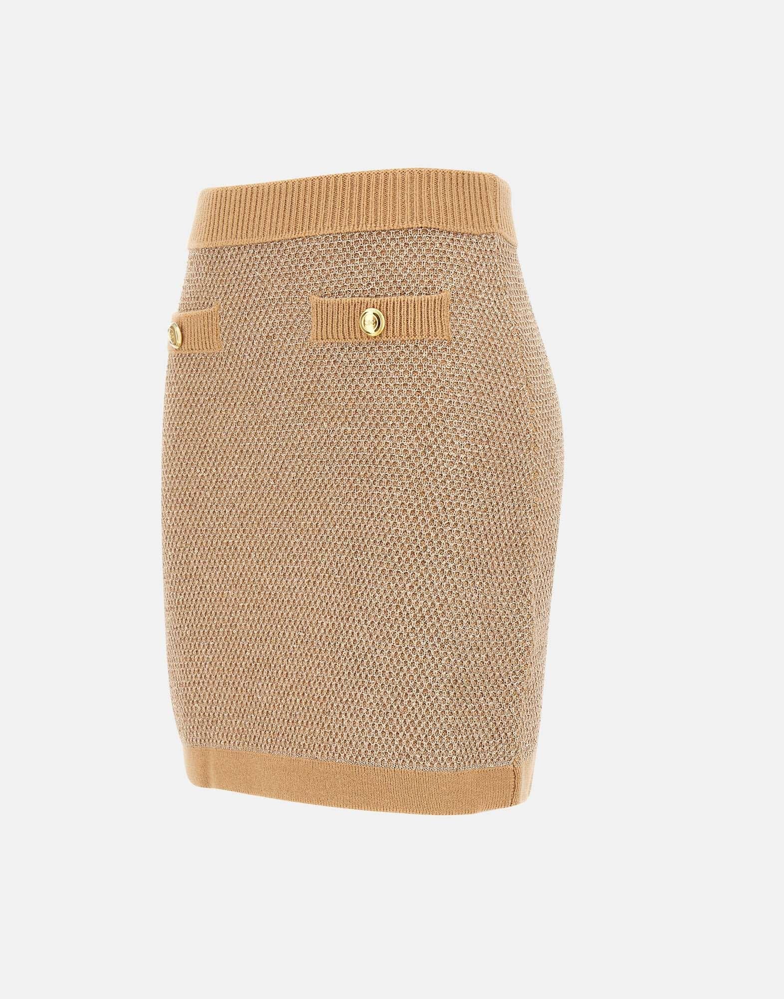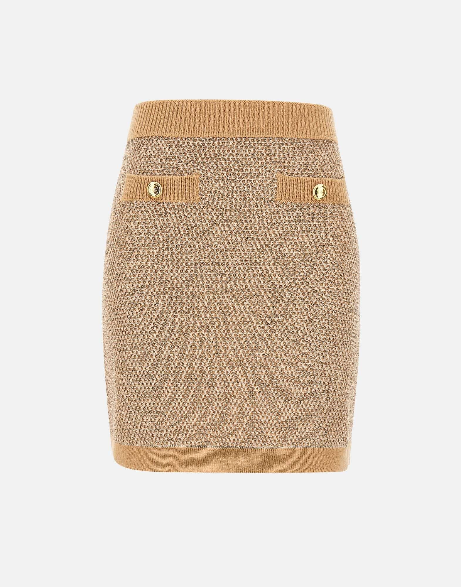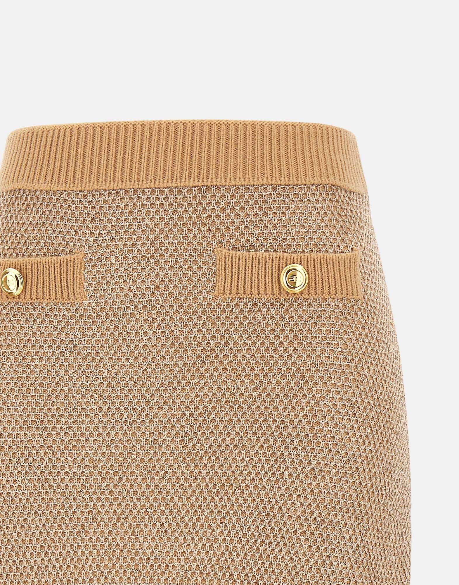 Elisabetta Franchi "Daily" skirt in camel wool blend knit, featuring a sequined texture that illuminates the surface. Elastic waistband with ribbed trim, embellished with gold metal buttons with logo for a sophisticated detail. Length: 42 cm for size 40 IT. Slim fit. Made in Italy.