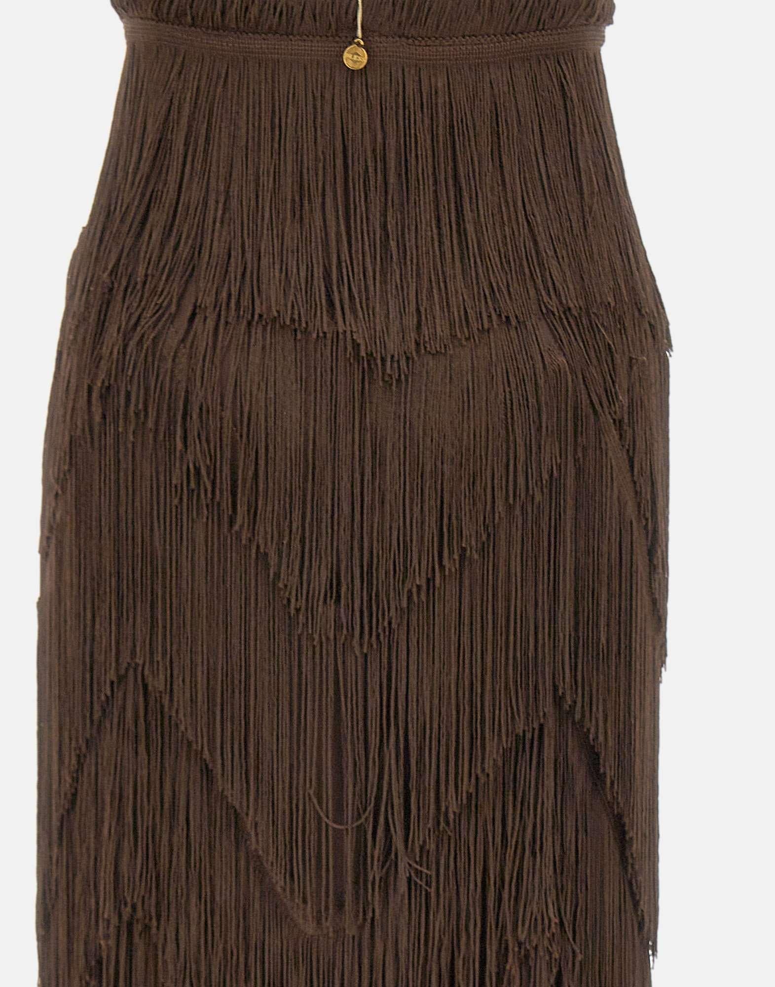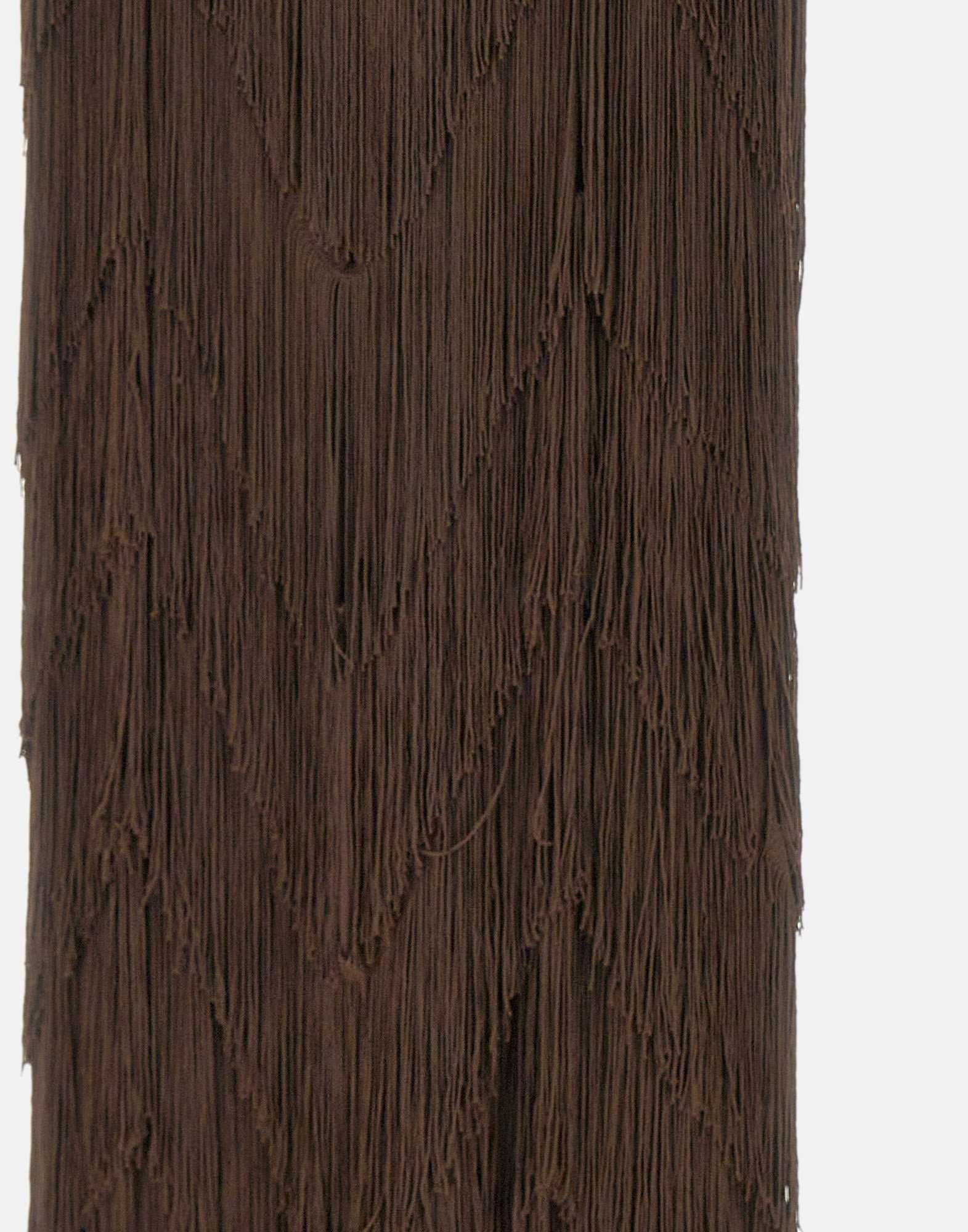 Bless "Dara" women's skirt in a chocolate brown tone, defined by a surface fully covered with layers of fringes arranged in a V-shaped pattern that creates movement and visual depth. The design features a long and straight silhouette that enhances the figure with elegance, completed by an asymmetrical hem that adds a contemporary and distinctive touch. The concealed side zip closure ensures a clean and functional fit. This women's long fringed skirt expresses a sophisticated and modern style, ideal for refined and statement looks.