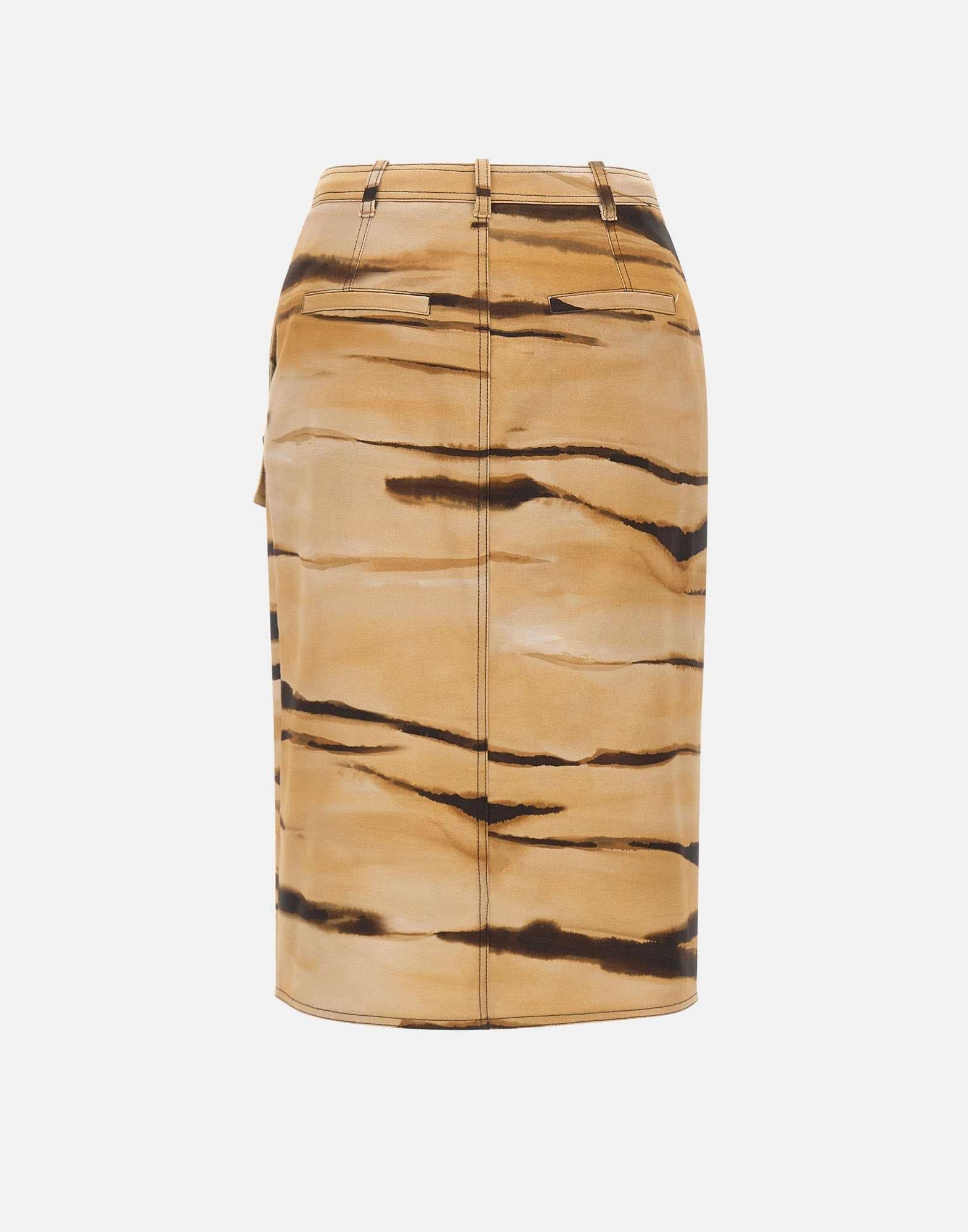 Elisabetta Franchi women's skirt crafted in drill with an all-over tiger-inspired print in shades of brown, designed to reinterpret safari style with a bold and contemporary attitude. The style is enhanced by applied flap details and contrast topstitching that highlights the construction with a distinctive touch. A zip closure concealed by a placket with buttons, side pockets, rear welt pockets, and a front slit complete the design with both function and femininity. Gold-tone metal buttons add a luminous and refined finish. Slim fit. Made in Italy.