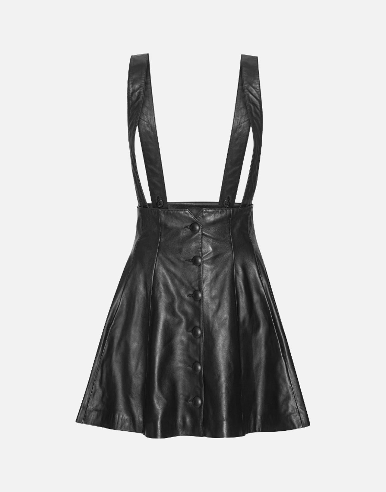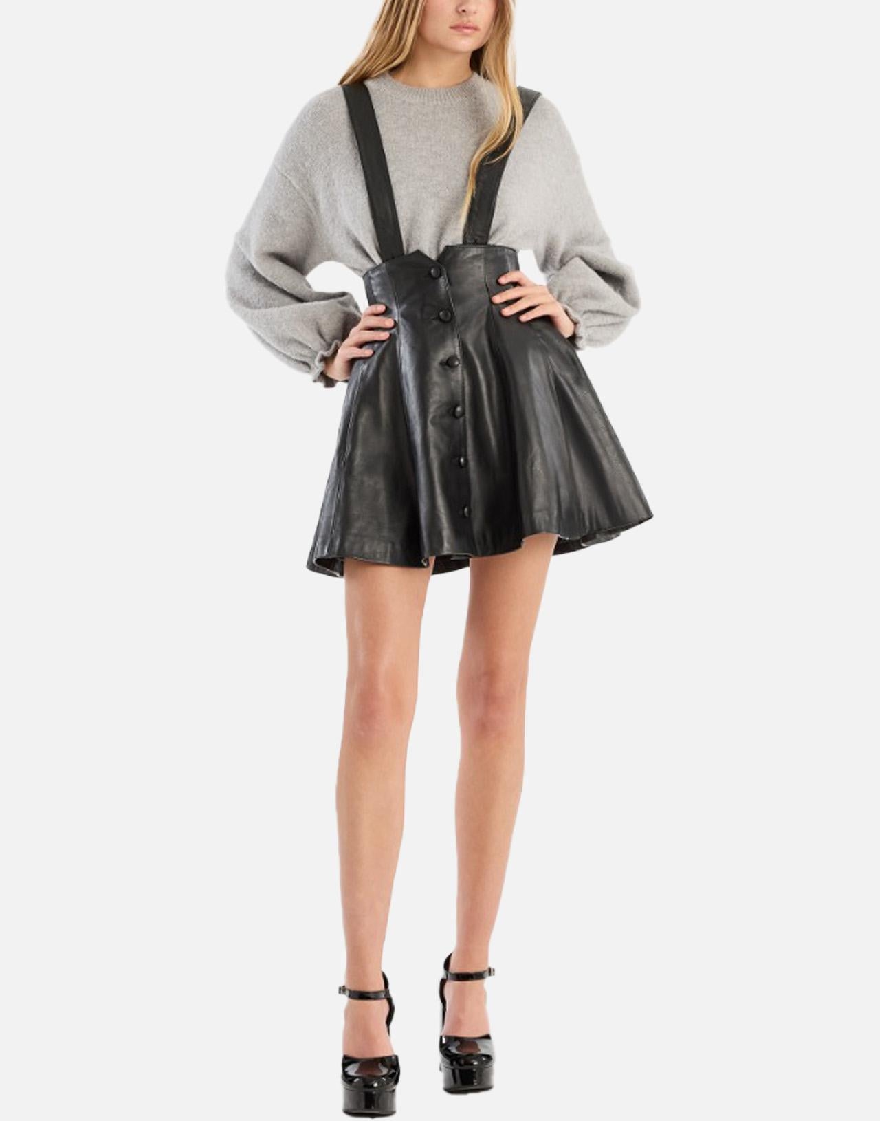 Rotate black leather skirt with a flared silhouette and high fitted waist. Featuring removable suspenders and a front button closure, it offers versatile styling options with a bold, feminine edge. Ideal to pair with fitted tops or shirts for a statement look.