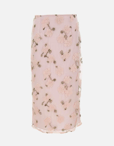 Rotate light pink mesh-effect midi skirt embellished with delicate floral sequin embroidery for a luminous, feminine look. Straight pencil silhouette with a mid-length cut and back slit for ease of movement. Fully lined in pink viscose for comfort and perfect fit. A refined and elegant piece, ideal for evening wear and special occasions.