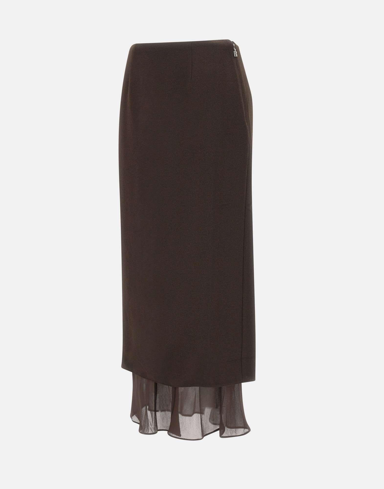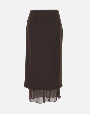 Rotate midi skirt in soft dark brown fabric featuring a clean silhouette and layered design with a longer semi-sheer viscose underlay that adds fluidity and depth. The back slit enhances movement, while the concealed side zip with branded puller ensures a refined finish. Regular fit, perfect for elegant and modern outfits.